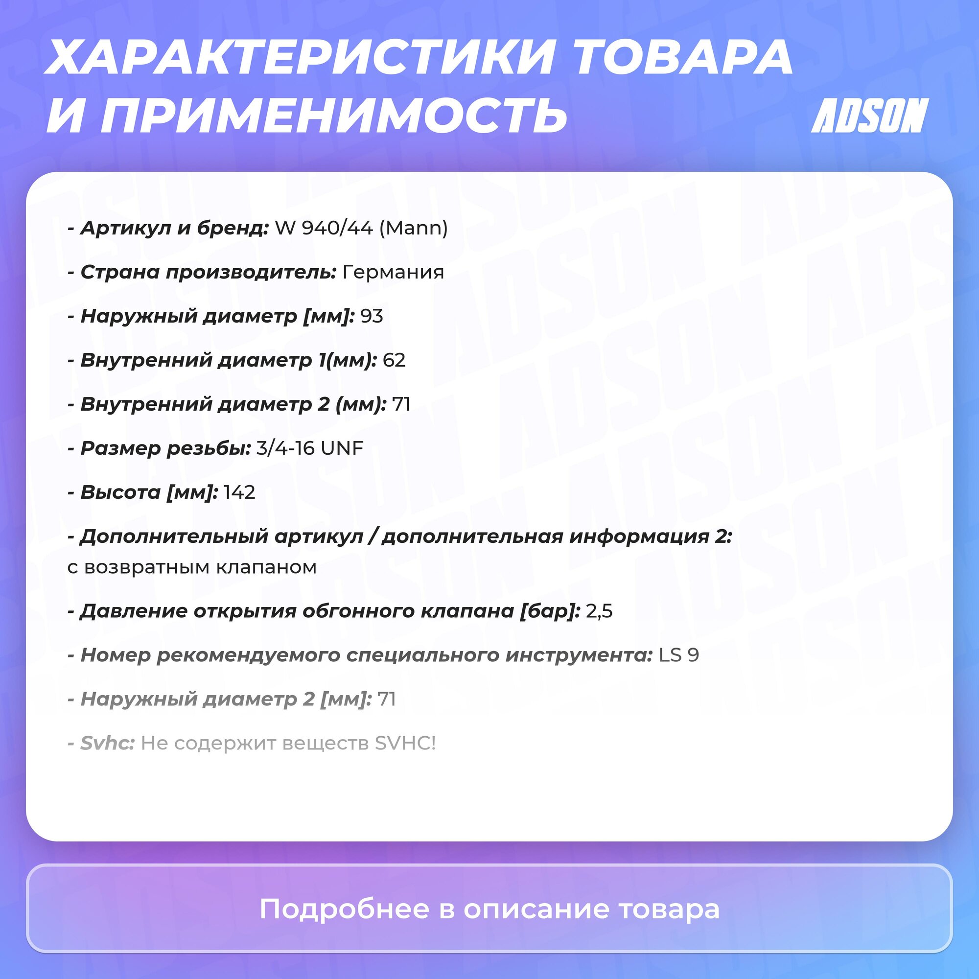 | Наименование модели | фильтр масляный двигателя W940/44 |