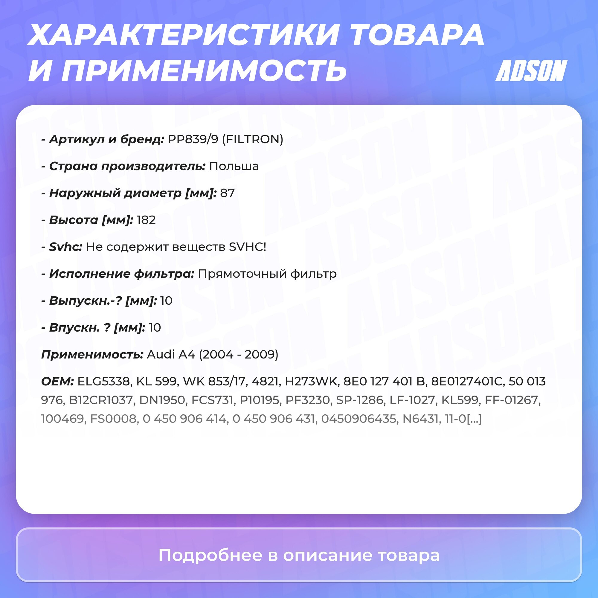 Фильтр топливный FILTRON PP 839/9 для Audi A4 2.7TDi/3.0TDi 04> обеспечивает тщательная и эффективную фильтрацию, задерживая мельчайшие примеси, которые в несколько десятков раз меньше песчинок. Высокое качество фильтров FILTRON обусловлено опытом и современными стандартами производства.Защита современных систем впрыскаИспользуемые в дизельных двигателях системы впрыска требуют очень эффективной фильтрации и отделения воды. FILTRON предлагает широкий ассортимент топливных фильтров для автомобилей с современными системами впрыска. Эти фильтры соответствуют самым высоким стандартам, благодаря высокотехнологичным решениям, таким как, например, многоступенчатое отделение воды.Фильтрующие материалы, адаптированные к требованиям двигателяВ топливных фильтрах FILTRON применяются высокоэффективные фильтрующие материалы, учитывающие требования изготовителя двигателя или транспортного средства. Эффективность и свойства используемых фильтрующих материалов испытываются в современной лаборатории, в которой ежегодно проводим около 4000 тестов.