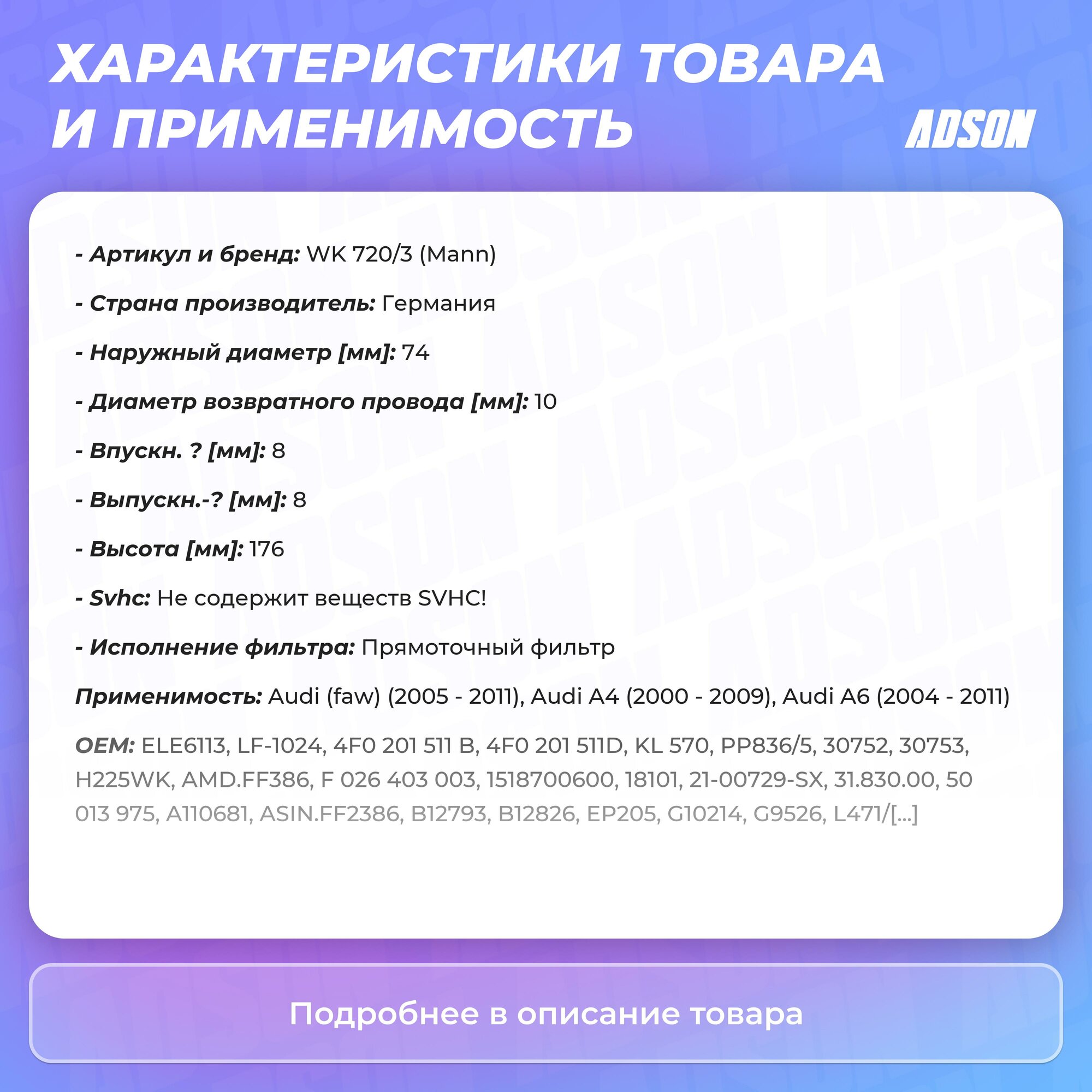 | Наименование модели | фильтр топливный MANN-FILTER WK720/3 |