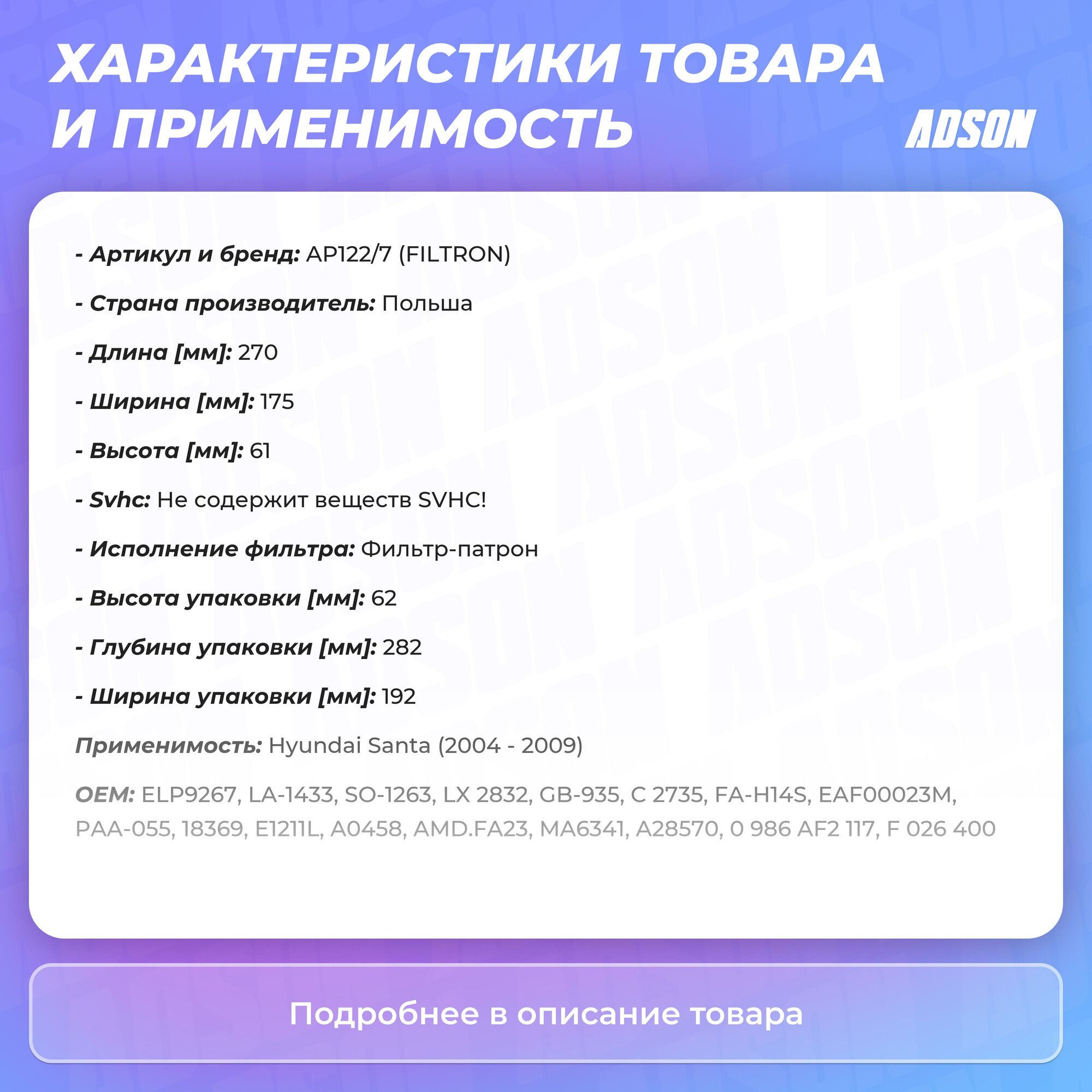 Фильтр воздушный FILTRON AP 122/7 для Hyundai Santa Fe 2.0/2.7i/2.2CRDi03> изготовлен с помощью современных фильтрующих материалов, созданных, в частности, на основе целлюлозных или синтетических волокон. Эти материалы обеспечивают эффективность фильтрации на уровне 99,9% для частиц размером всего в несколько микрон.Фильтрующая среда, стойкая к распространению огняВсе воздушные фильтры марки FILTRON имеют фильтрующие среды, которые, в соответствии с классом горючести F1 или S1, не поддерживают огонь (способствуют самоугасанию пламени) и могут защитить пассажиров от пожара транспортного средства в случае всасывания окурка сигареты в систему подачи воздуха.Прочные прокладки воздушных фильтров, обеспечивающие герметичностьДля производства прокладок воздушных фильтров используется уникальная смесь полиуретана, отличающаяся упругостью и устойчивостью к сжатию в экстремально высоких температурах. Благодаря исключительным свойствам прокладок, воздушные фильтры FILTRON сохраняют герметичность в корпусе даже в очень сложных условиях эксплуатации.Складки стабилизированы с помощью перфорированного покрытияСкладки (гофры) воздушных фильтров FILTRON стабилизируются с помощью специального перфорированного покрытия, предотвращающего слипание соседних складок. Благодаря равномерному распределению складок, воздух фильтруется всей поверхностью фильтрующего материала, способствуя полному использованию мощности двигателя.