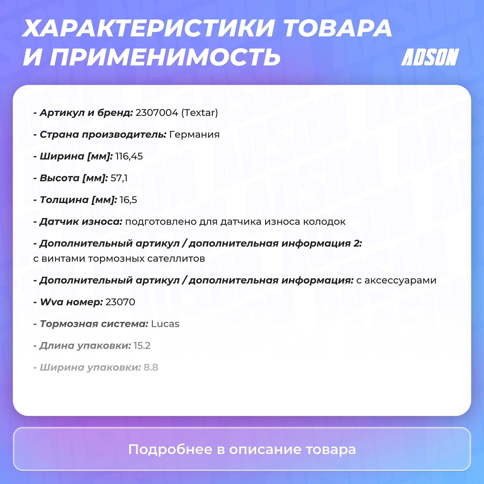 отличное соотношение цены и качества. Передовые технологии материалов, использованные при производстве этих колодок, позволяют использовать их даже в самых жестких условиях активной и динамичной езды и резкого оттормаживания на больших скоростях. Бережно относятся к тормозным дискам. Многослойный состав рабочей поверхности колодок обеспечивает прекрасную защиту от перегревания, коррозии, а виброустойчивые подушки на каждой колодке гарантируют комфортное торможение.Идеально работают в паре с тормозными дисками TEXTAR, MINTEX, ATE, TRW, BoschОриентировочный пробег Текстар (в зависимости от стиля вождения): 30.000 -;