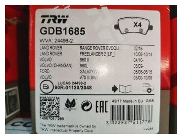 50.000 км.ТРВ производится на собственном заводе компании в Германии.Все колодки TRW имеют усовершенствованное силикатное покрытие COTEC, улучшающее контакт между тормозным диском и колодкой и позволяющее практически не «притирать» колодки после замены. Использование передовых технологий и собственное производство позволяют компании ТРВ уже много лет оставаться одним из лидеров рынка производства и разработки тормозных систем. Продукция TRW поставляется на сборочные конвейеры ведущих автопроизводителей, таких как Mersedes, BMW, VW, Шкода, Seat, Ford, Пежо, Ситроен и др.Колодки TRW являются аналогом следующих товаров: 05P1474, 0986494213, 0986494248, 1247000SX, 13046027222, 13046027362, 181776, 2449601, 2449602, 244961701, 301928, ADF124202, MDB2863, P1336300, P24078, BD7817, P86021, FDB4237, LP2008, B1G10207872, B1G10209002, FBP1497, CBP01613, 6116851, JQ1013836, 8DB355012941, PN0463, 123600, 2123600.Применяемость тормозных колодок ТРВ для автомобилей CHEVROLET, FORD, LAND ROVER, PEUGEOT, VOLVO можно посмотреть на соседней вкладке.