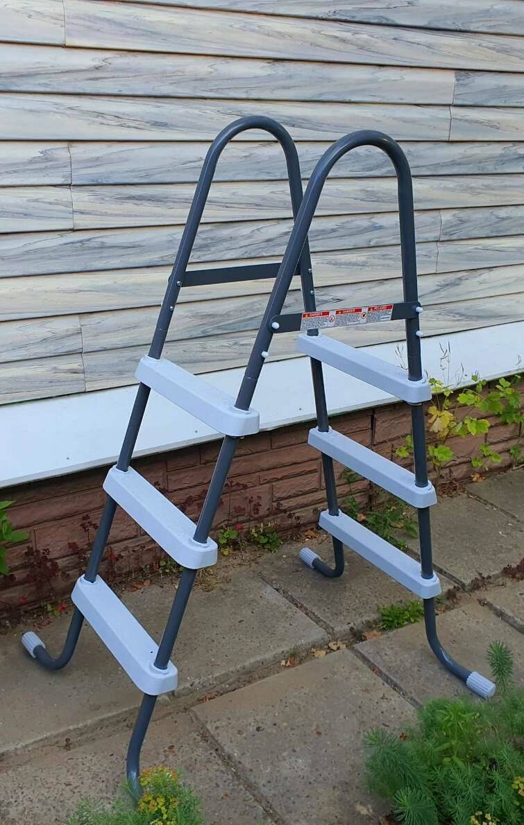 Данную лестницу приобрели для надувного бассейна с высотой 91 см. Остаётся ещё небольшой запас по высоте, может подойти и к бассейнам повыше. Порадовала надёжность конструкции, тяжёлый прочный метал, крепкий твёрдый пластик, собирается вся конструкция быстро, по схеме сборки всё понятно. Выдержит легко с запасом взрослого человека. В бассейне стоит устойчиво