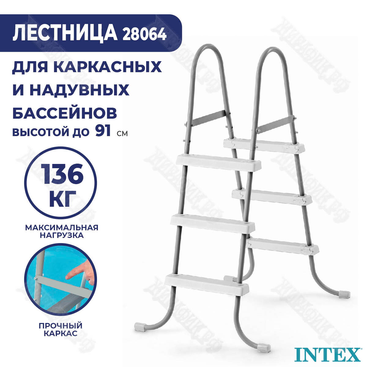 Intex – лестница для каркасных и надувных бассейнов INTEX с высотой борта до 91 см. Легко и быстро устанавливается, имеет широкий угол между сторонами, достаточный для того, чтобы не касаться стенок бассейна и в тоже время быть удобной в использовании.