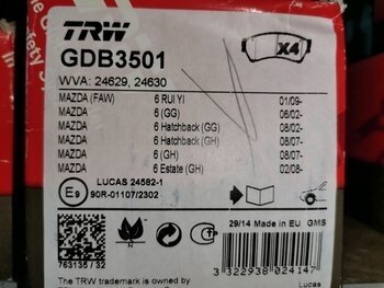 50.000 км.ТРВ производится на собственном заводе компании в Германии.Все колодки TRW имеют усовершенствованное силикатное покрытие COTEC, улучшающее контакт между тормозным диском и колодкой и позволяющее практически не «притирать» колодки после замены. Использование передовых технологий и собственное производство позволяют компании ТРВ уже много лет оставаться одним из лидеров рынка производства и разработки тормозных систем. Продукция TRW поставляется на сборочные конвейеры ведущих автопроизводителей, таких как Mersedes, BMW, VW, Шкода, Seat, Ford, Пежо, Ситроен и др.Колодки TRW являются аналогом следующих товаров: 000061BSX, 119602, 181868, ADM54296, B110986, BD5118, FDB4062, JQ101104, MDB2935, P49039, PA346AF, PN5806, 5003346, 8DB355013761, LP2111, 0252458217/W, N3603071, CBP31787, 8860, 1043F, 6135019, 2119602, BBP2027, 8DB355013761, 2458202.Применяемость тормозных колодок ТРВ для автомобилей MAZDA можно посмотреть на соседней вкладке.