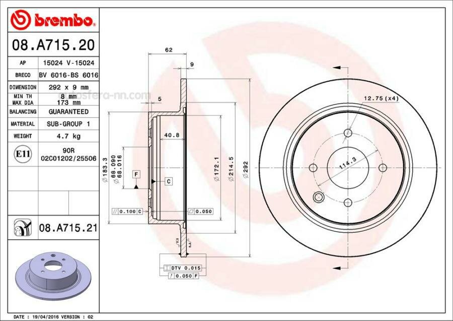 | Диаметр диска/барабана | 292 мм |