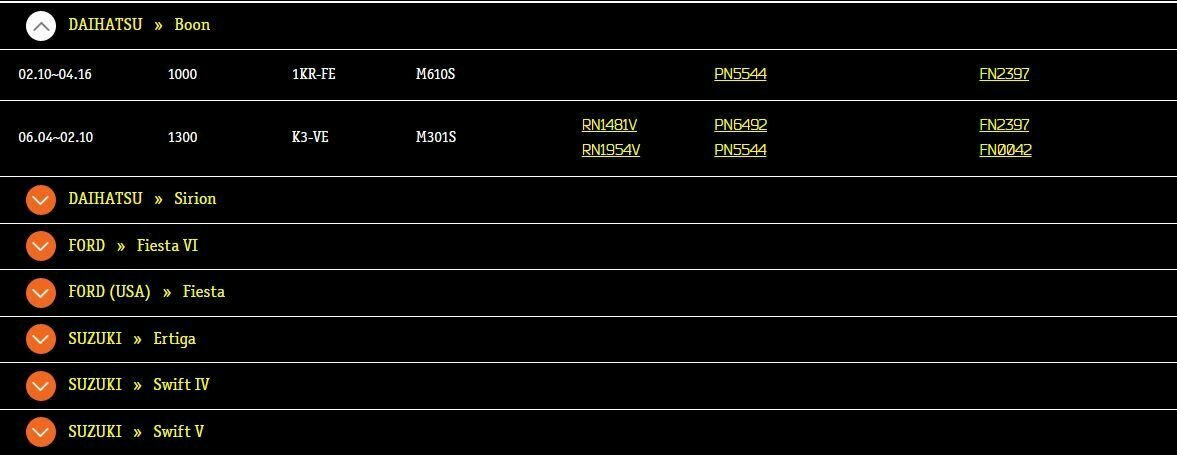 | Модель автомобиля | Materia; Sirion; Fiesta; 2; Justy; Swift |