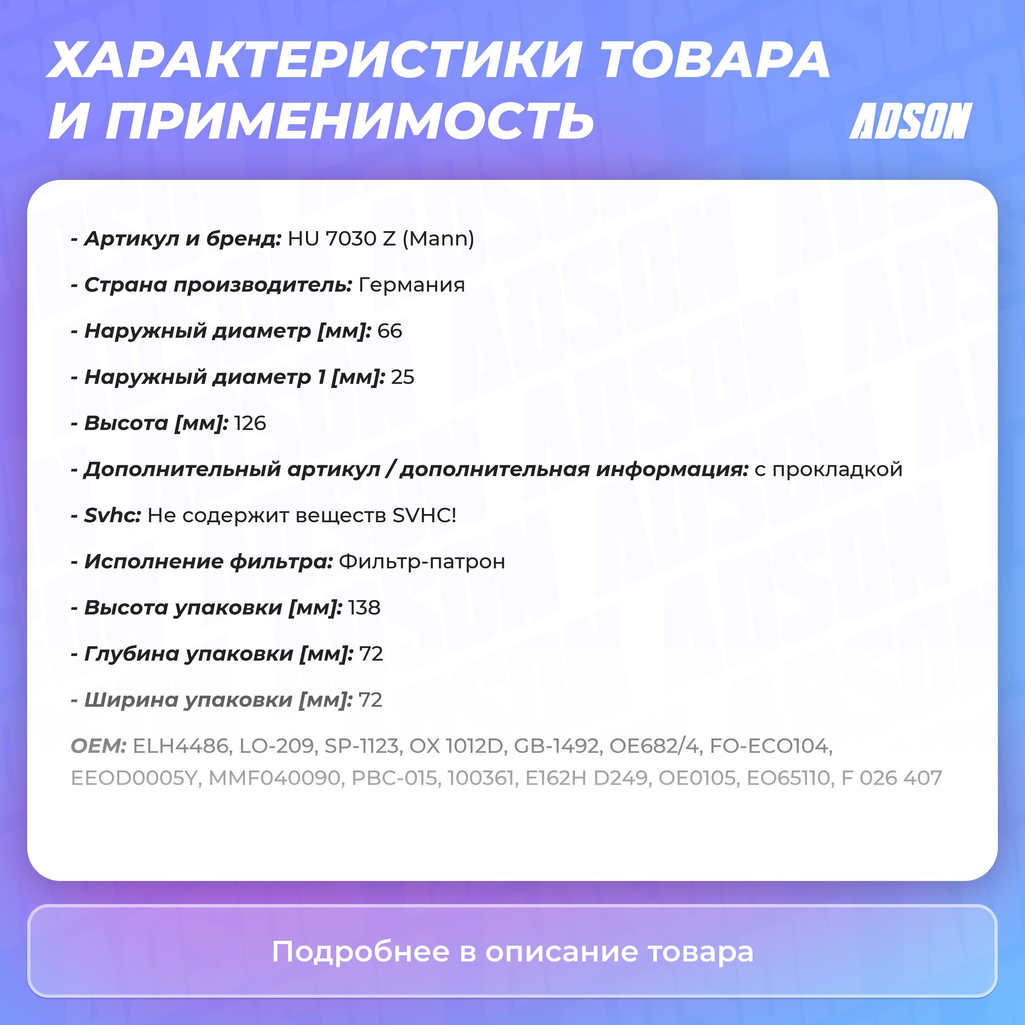 | Наименование модели | фильтрующий элемент масляного фильтра HU7030Z |