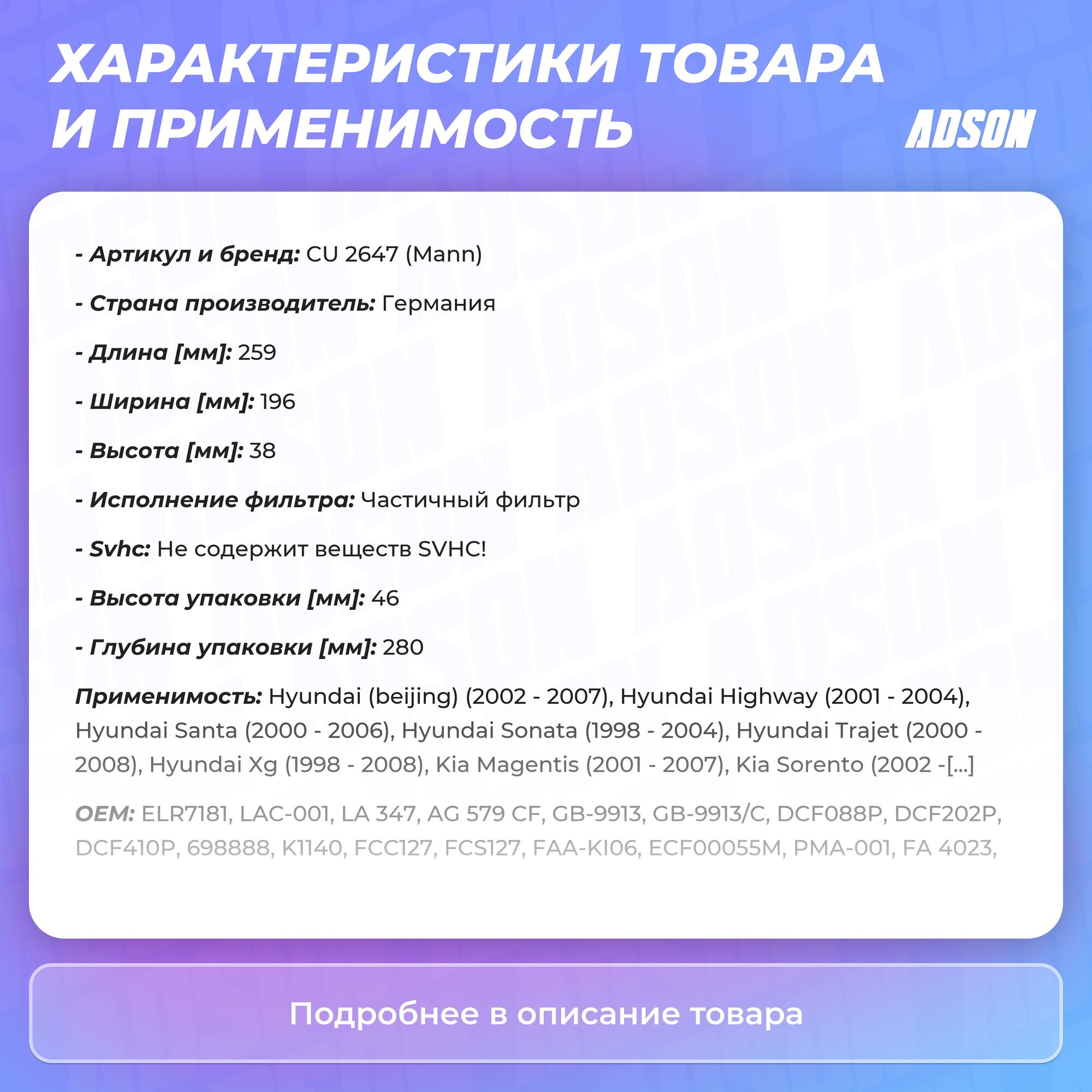 Сервис сравнения цен СкидкаГИД предлагает сравнить цены на товар «Салонный фильтр Mann-Filter CU2647»