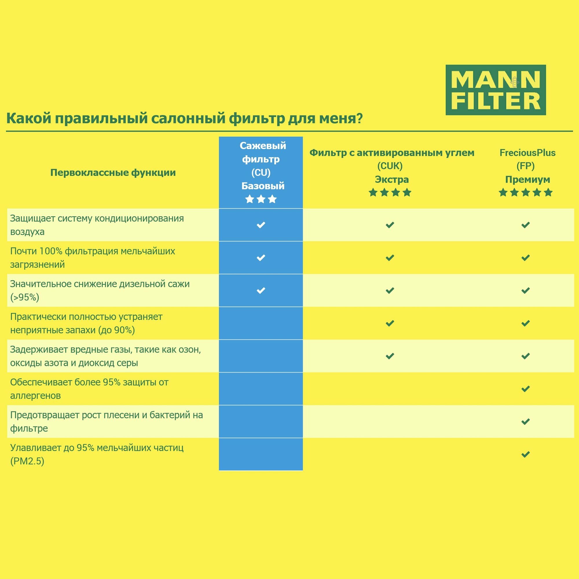 Автомобильные фильтры, системы фильтрации воздуха и жидкостей торговой марки MANN-FILTER производит крупнейшая в мире компания в этой сфере. Вы всегда можете доверять фильтрам MANN, как доверяют все крупнейшие мировые автопроизводители, конвейерным поставщиком которых является MANN-FILTER. Каждый десятый фильтр в мире - MANN-FILTER. Как в новом автомобиле, в качестве оригинальной детали, так и на прилавках магазинов запчастей или СТО. Для всех автомобилей: европейских, американских, корейских и японских марок. Более 75 лет MANN-FILTER работает для того, чтобы сегодня вы использовали все преимущества оригинальных комплектующих - выгодное соотношение цены и гарантированного качества, возможность оптимизировать свои расходы, продлить ресурс агрегатов и повысить комфорт в эксплуатации.Используйте MANN-FILTER, и автомобиль будет вам благодарен!