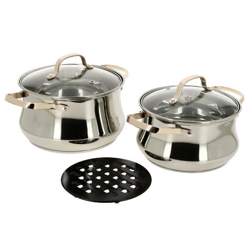 Набор будет отличным дополнением к комплекту вашей кухонной утвари. Приготовление любимых блюд с его приобретением перейдет на качественно новый уровень и вы сможете воплотить в жизнь любые кулинарные идеи. В комплект входят две кастрюли с крышками и круглая подставка под горячее.