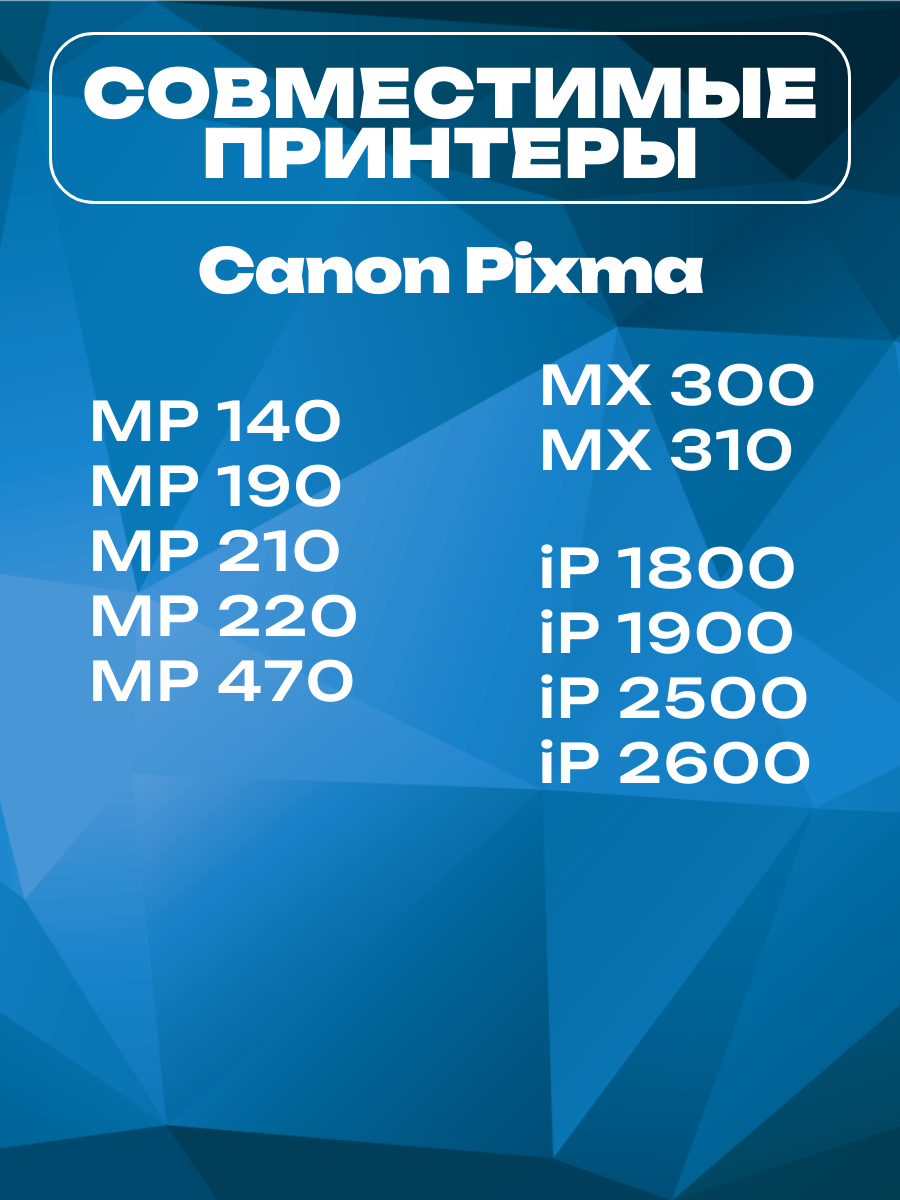 | Совместимость по модели | PIXMA iP1800, PIXMA iP1900, PIXMA iP2500, PIXMA iP2600, PIXMA MP140, PIXMA MP190, PIXMA MP210, PIXMA MP220, PIXMA MP470, PIXMA MX300, PIXMA MX310 |