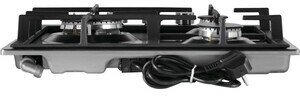 Данная модель может считаться универсальной не только из-за лаконичного внешнего вида. Три конфорки разных размеров и мощностей позволяют готовить самые разные блюда. Есть мощная конфорка WOK с тройным рядом пламени («тройная корона»), расположенная отдельно, и две меньших по размеру. Одна из них оборудована адаптером для кофейника, который входит в комплектацию. Также в комплекте есть чугунная подставка для посуды WOK, которая предназначена для самой большой конфорки.
