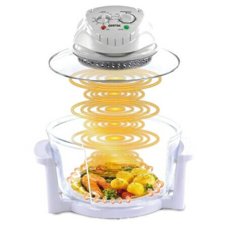 Конкретно о CENTEK CT-1456. Каждый, кто решил обзавестись данной моделью, ищет информацию о размерах стеклянной чаши аэрогриля, то есть, какую посуду можно использовать. Я брал с собой рулетку, потому что, в интернете информации не нашел: 30,5 см горловина и 27,5 дно чаши. Для приготовления курицы+картофеля использую нижнюю подставку, на нее ставлю форму для выпечки. Пятьдесят минут при 200 градусах для "маринованной" курочки( голень, окорочка). Выглядит как на рекламной картинке. Эта модель ...