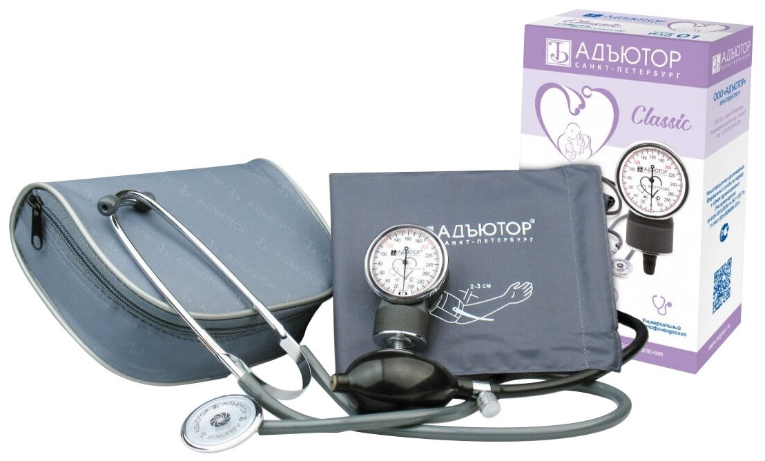 Основная модификация серии Classic. Металлический анероидный манометр. Нагнетатель из латекса, металлический игольчатый клапан сброса воздуха (боковой винт). Удобная и гигиеничная манжета из нейлона с металлическим кольцом. Цельнолитая 2-трубочная пневмокамера из латекса. Металлический стетофонендоскоп «Адъютор» СФ-01 с односторонней головкой и логотипом.