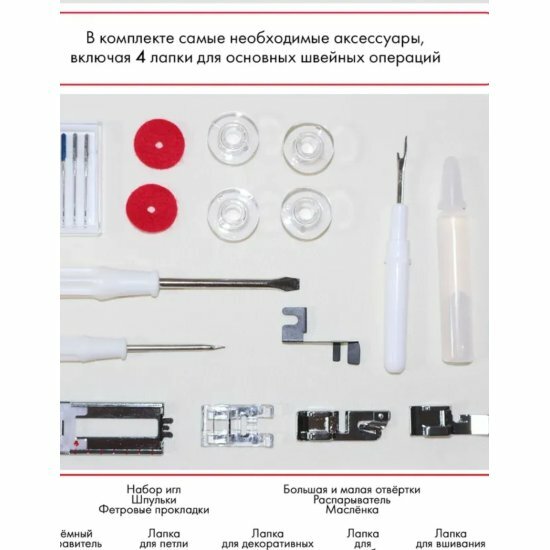 | Комплект поставки | жесткий чехол; лапка стандартная; лапка для молнии; лапка для выметывания петли; отвертки; шпульки; масленка; набор игл |