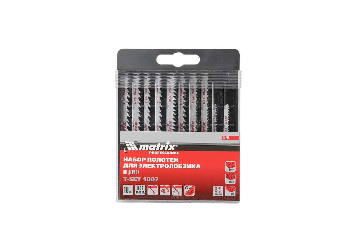 Универсальный набор полотен для электролобзика MATRIX предназначен для быстрого и чистого пиления древесины, работ по ламинату, а также для фигурного выпиливания с различной скоростью и точностью. В состав набора входят полотна: T144D, T244D, T111С, T101D, T101B, T101BR, T101AO, T119BO