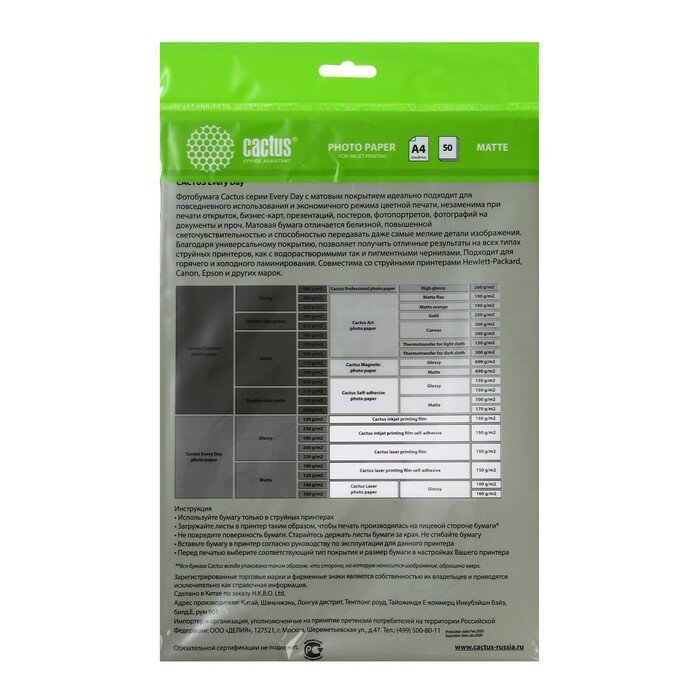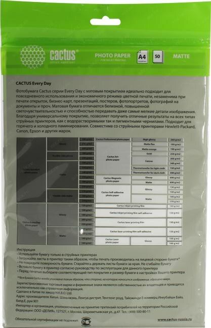 Название: Фотобумага белая матовая для струйной печати; Описание: Матовая фотобумага Cactus идеально подходит для печати графиков и презентаций. А на бумагах невысоких плотностей удобно делать многостраничные отчеты. Матовая бумага будет незаменима при печати приглашений, бизнес-писем, оригиналов важных документов и меню. Также эта бумага идеально подходит для печати фото на документы.; Тип: Фотобумага; Формат: А4; Количество листов: 50; Плотность: 100; Тип фотобумаги: Матовая