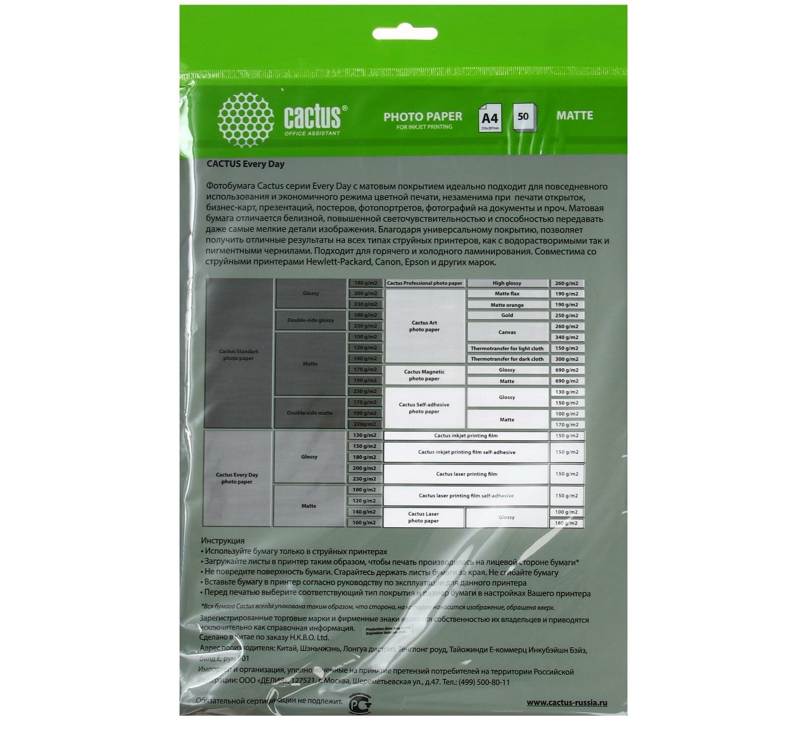 Название: Фотобумага белая матовая для струйной печати; Описание: Матовая фотобумага Cactus идеально подходит для печати графиков и презентаций. А на бумагах невысоких плотностей удобно делать многостраничные отчеты. Матовая бумага будет незаменима при печати приглашений, бизнес-писем, оригиналов важных документов и меню. Также эта бумага идеально подходит для печати фото на документы.; Тип: Фотобумага; Формат: А4; Количество листов: 50; Плотность: 140; Тип фотобумаги: Матовая
