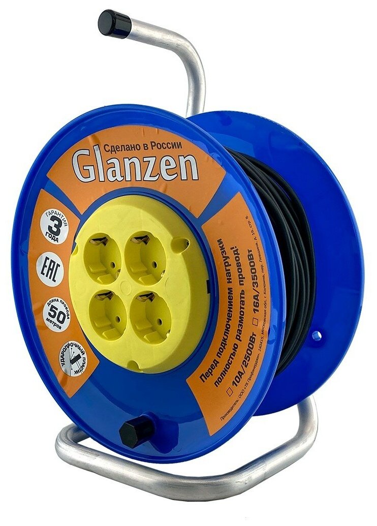 Удлинитель силовой на катушке GLANZEN 4 гн ПВС 3х075 мм 50 м