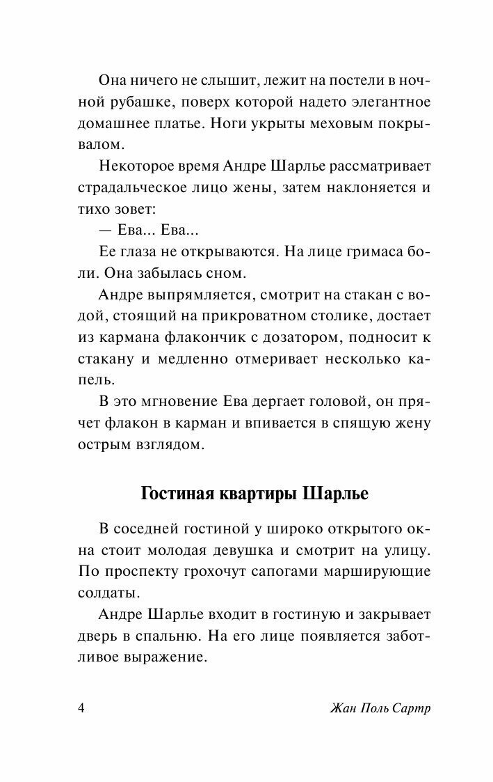 Вполне "читабельная", но далеко не самая сильная пьеса Сартра. Пьесу губит излишняя простота. Герои настолько предсказуемы, их диалоги настолько второстепенны, а действие настолько лишено всякой интриги, что иногда складывается странное ощущение какой-то сырой недоделанности, своего рода вторичности по отношению, например, к "Стене", "За закрытыми дверями", "Грязными руками" - того же Сартра.