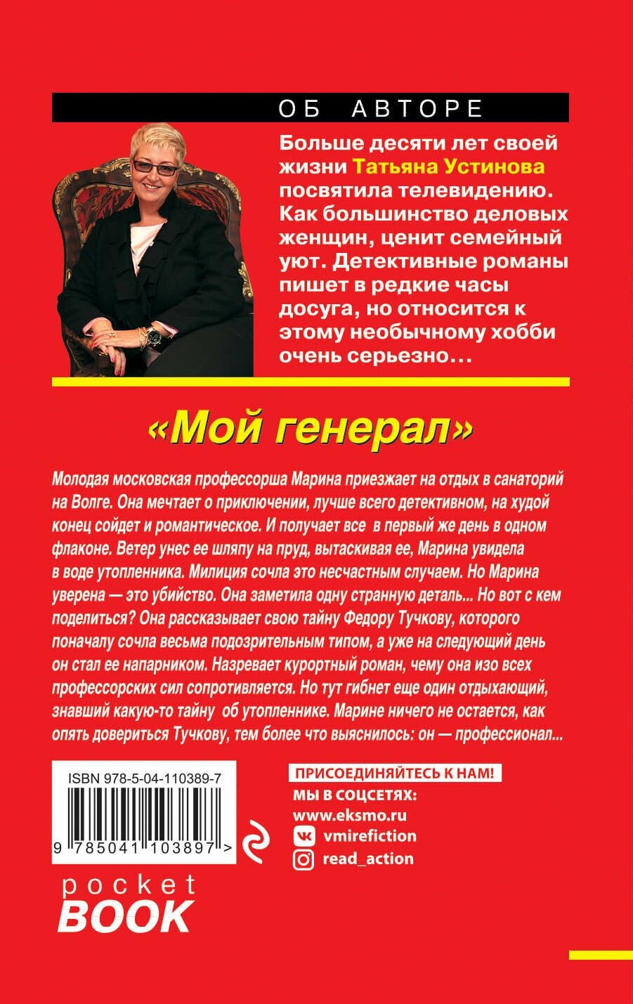 Приобрела сразу несколько детективных романов Татьяны Устиновой. Начала чтение с детектива "Мой генерал". При первом чтении сюжет произведения показался "растянутым". Четырнадцать действующих лиц, много диалогов между ними, трудно решить, на кого надо обратить внимание, кто помогает в раскрытии преступлений и кто виноват. Но при перечитывании этого произведения всё встало на свои места. Хороший детектив, интересный, как и другие произведения Татьяны Устиновой.