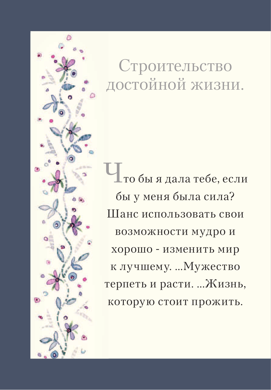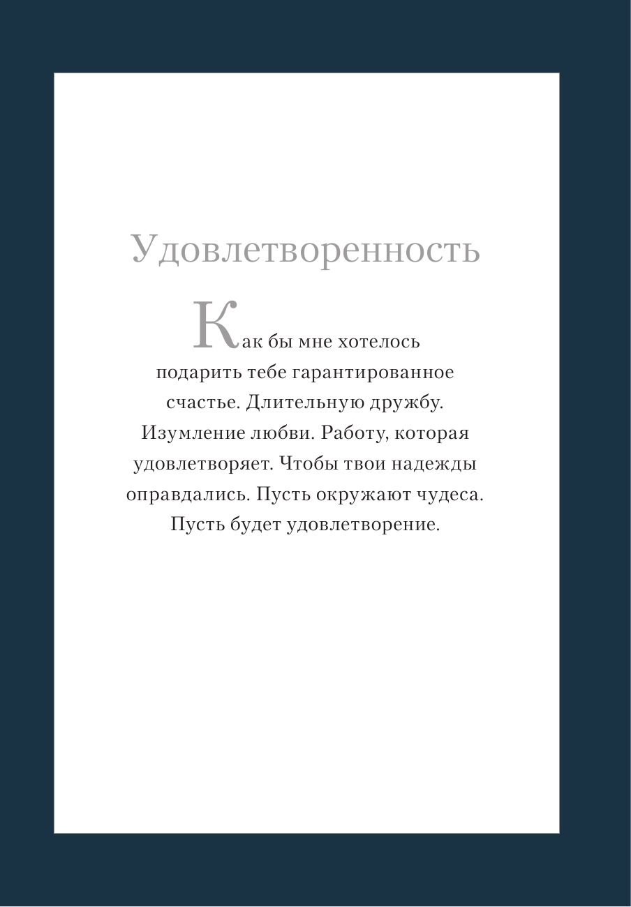 Прекрасное дополнение к подарку. Такую книжку можно подарить сыну, брату, другу или просто близкому человеку. Она рассчитана скорее на мужчин. Слова в ней взрослые, серьезные и очень глубокие, много таких, которые не придут в голову самому. В конце есть место для собственных пожеланий.