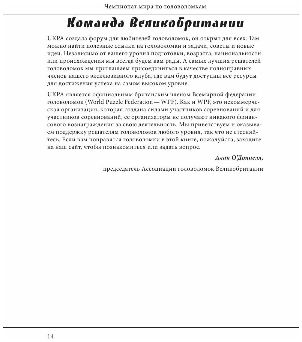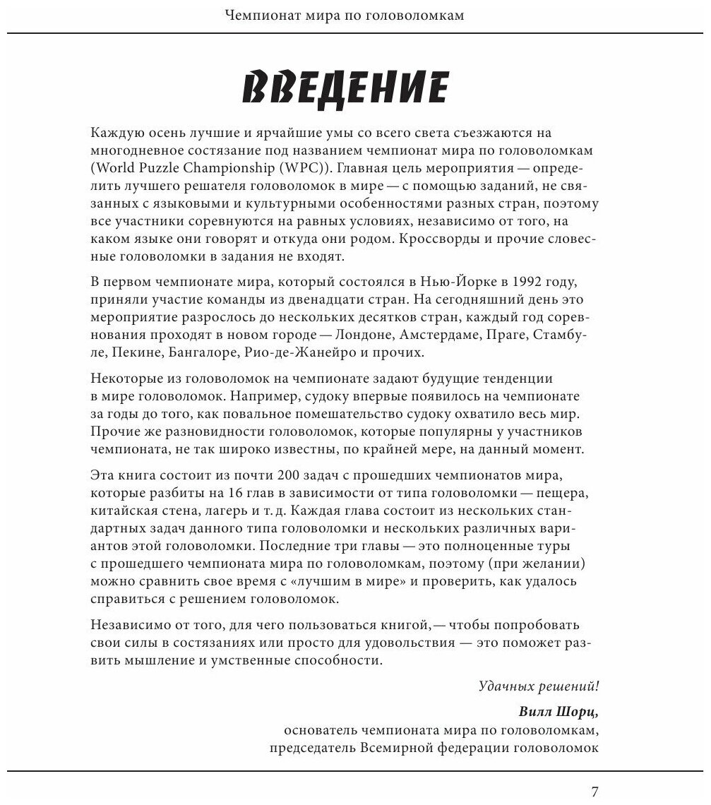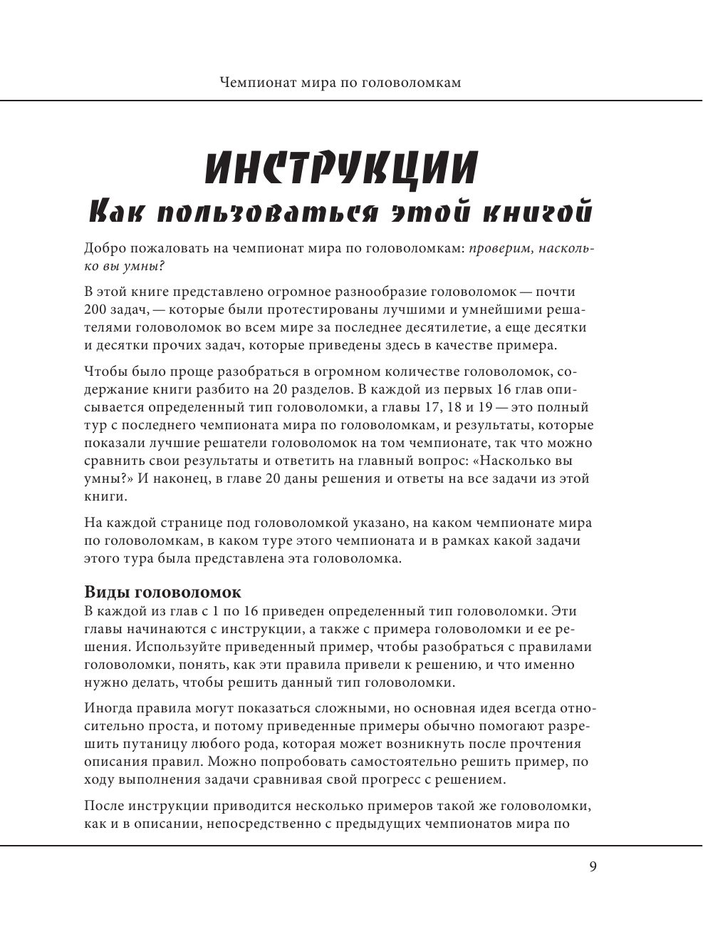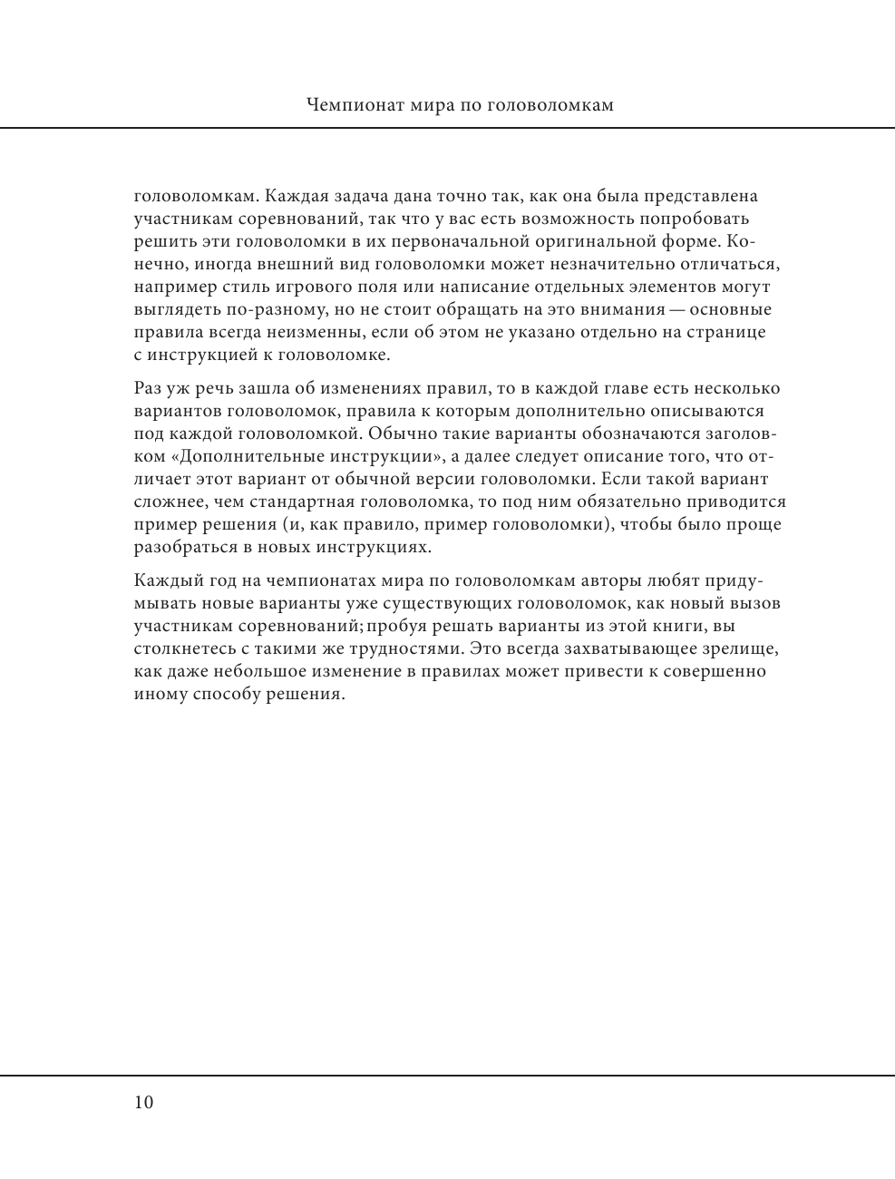 Книга содержит более 200 головоломок различных типов, расположенных в 19 тематических главах, включая широкий спектр уникальных вариантов головоломок, созданных специально для чемпионата мира по головоломкам.