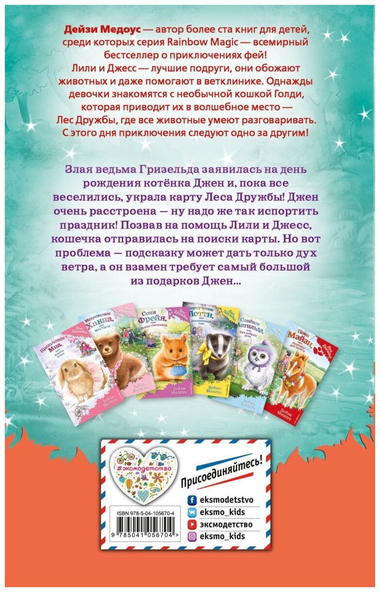 В Лесу Дружбы завелся вредный дух ветра. Он зло шутит, устраивает мелкие пакости и, в общем, плохо себя ведёт. А в завершение всего он украл и спрятал карту Леса Дружбы. Лили и Джесс попытались с ним договориться и вернуть карту, но взамен дух ветра потребовал… подарок. Он хочет самый большой из подарков, которые котёнок Джен получила на день рождения! Как же поступить Джен?