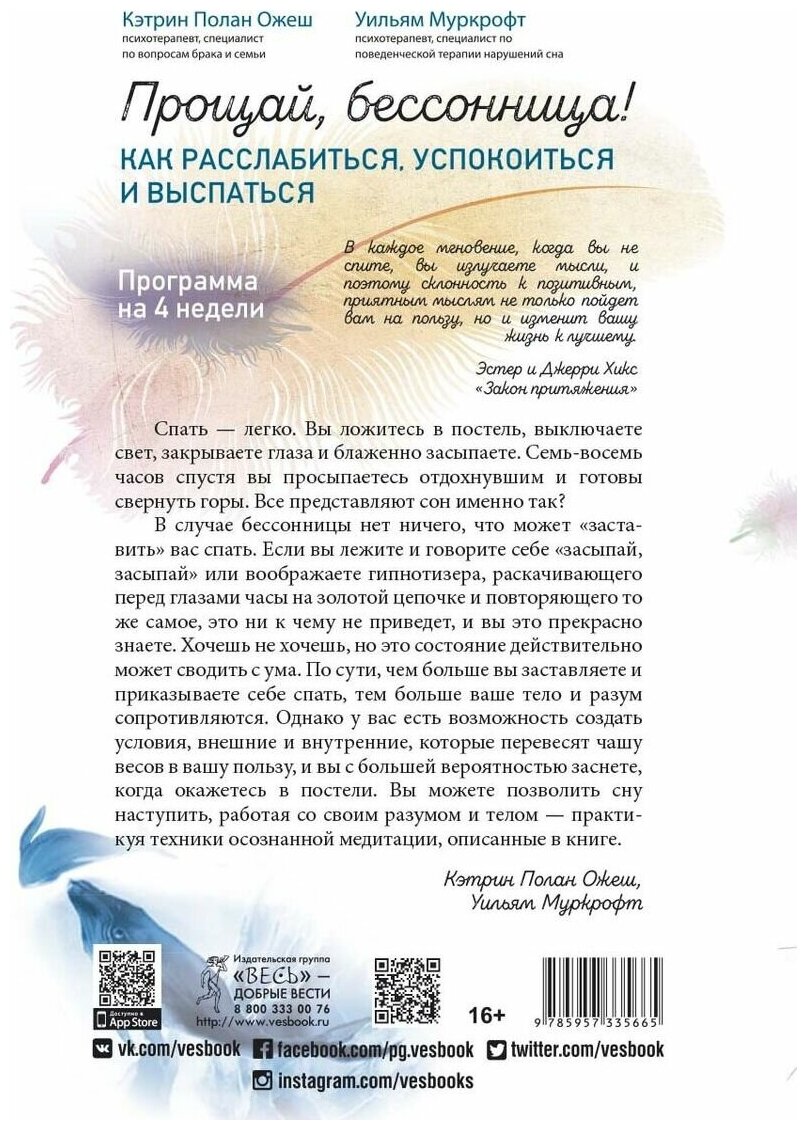 На сегодняшний день товар «Книга: Прощай бессонница! Как расслабиться успокоиться и выспаться. Программа на 4 недели (3566) (Ожеш Кэтрин Полан, Муркрофт Уильям); Весь, 2020» можно купить с кешбеком в 4 магазинах: book24, Яндекс.Маркет, Буквоед, Читай-город