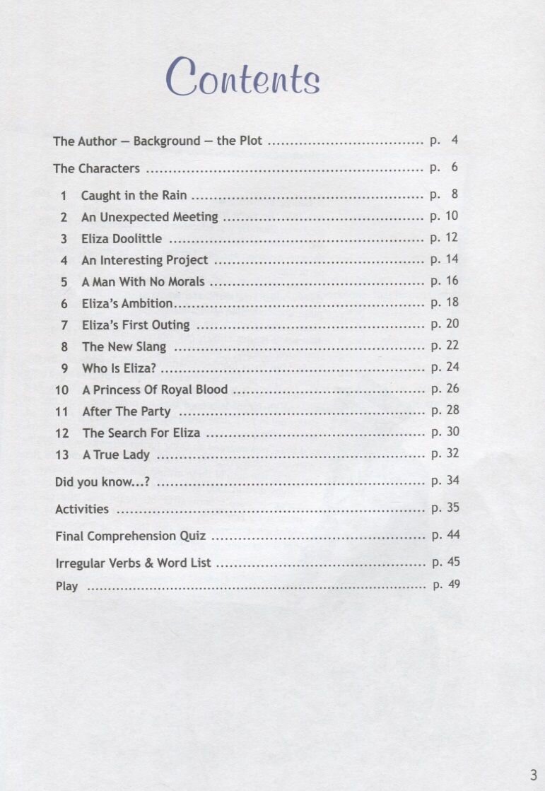 .Книга для чтения состоит из двух частей. Первая часть – адаптация известной пьесы Б. Шоу. Вторая часть содержит задания и упражнения по прочитанному материалу, пьесу на английском языке для постановки учащимися в школе и словарь.
