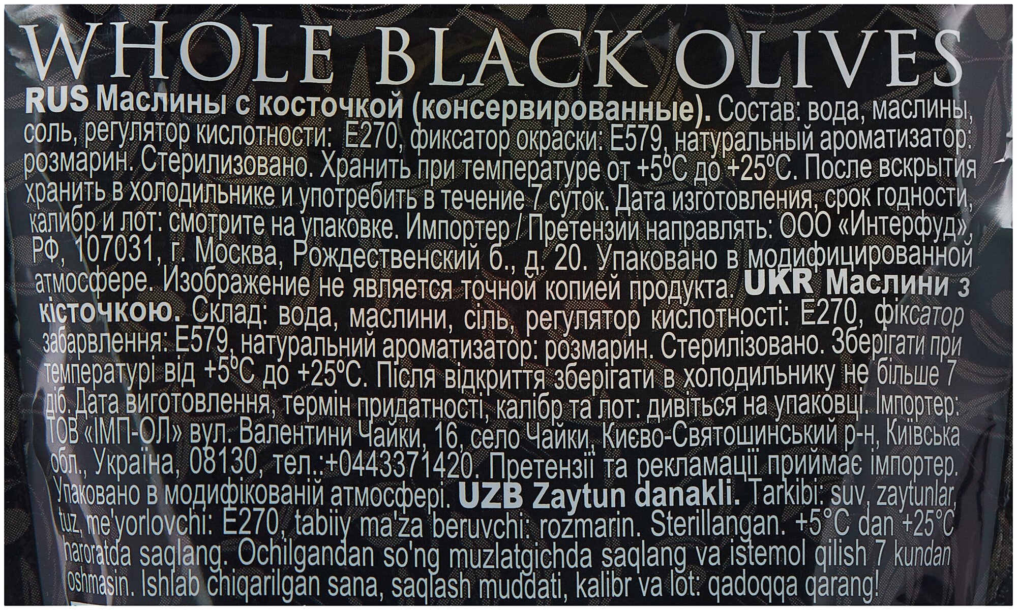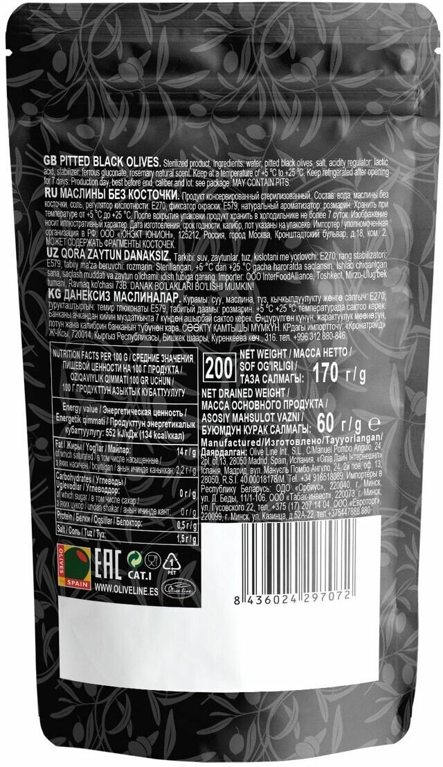 | Состав | Вода, маслины, соль, регулятор кислотности: Е270, фиксатор окраски Е579, натуральный ароматизатор: розмарин. |