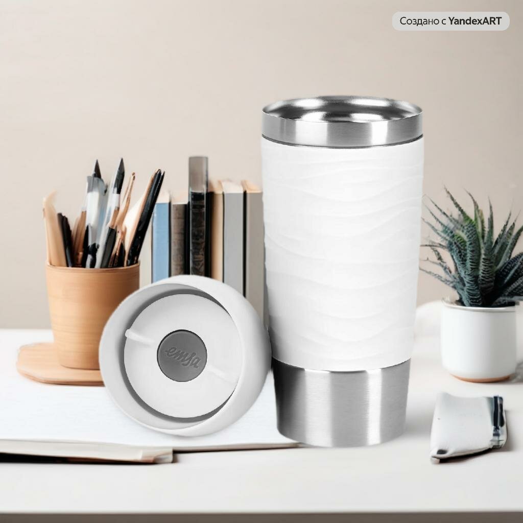 Термокружка на 100% герметична, а ее объем 0,36 л равен стандартной порции кофе в кофейне. Диаметр дна подходит для любых подстаканников в машине. Мягкий пояс комфортно лежит в руке и не дает термокружке выскользнуть.