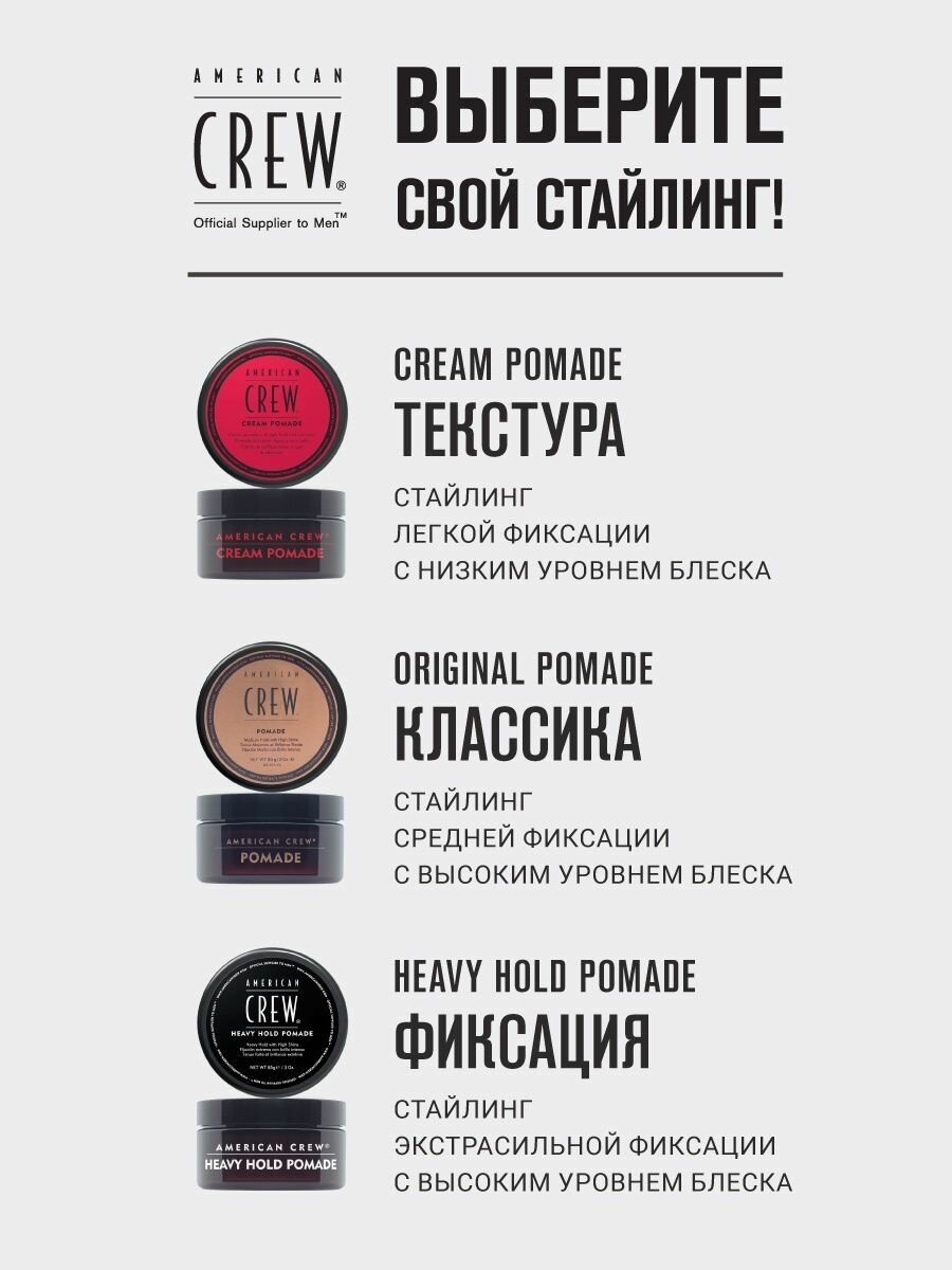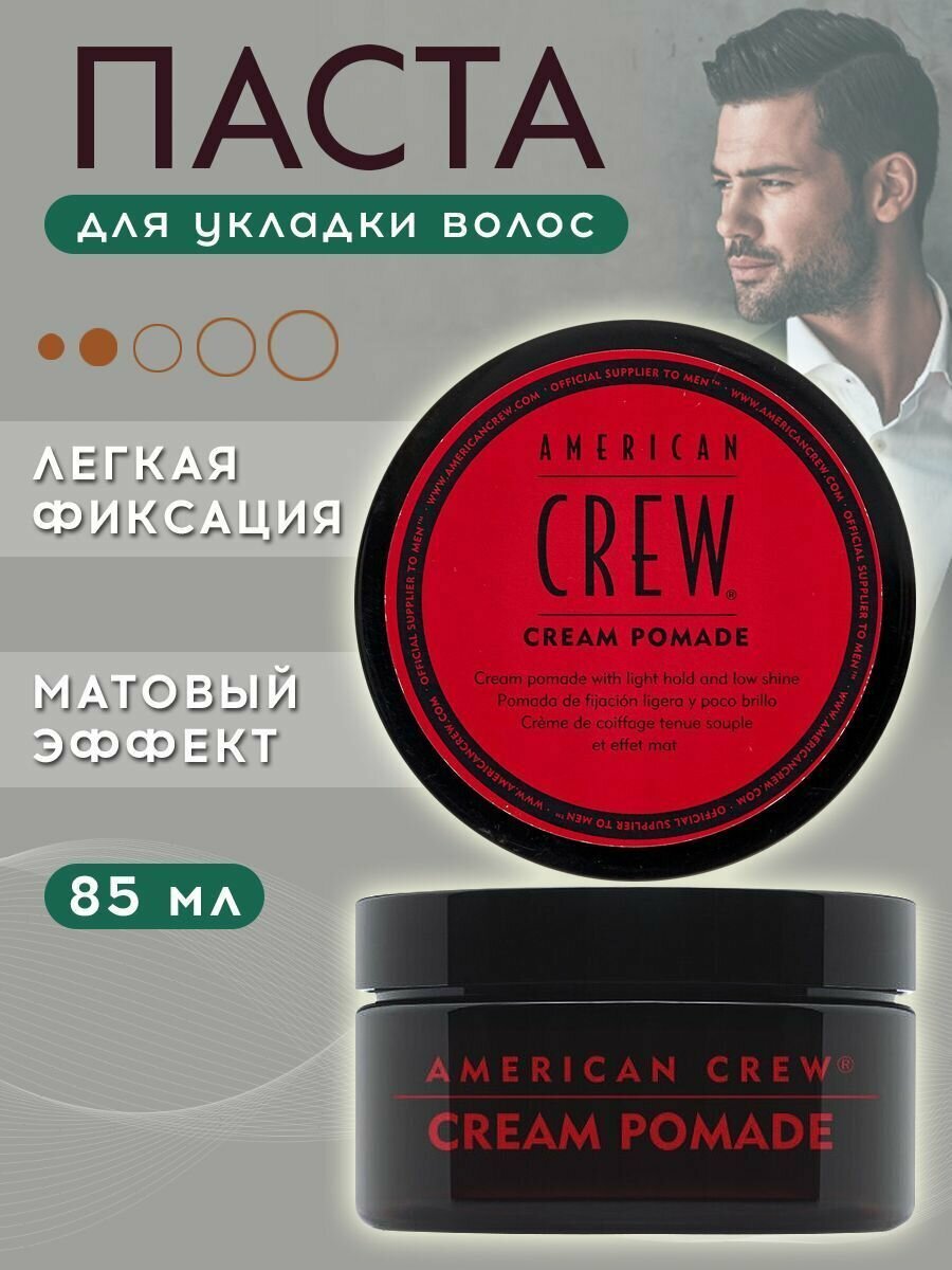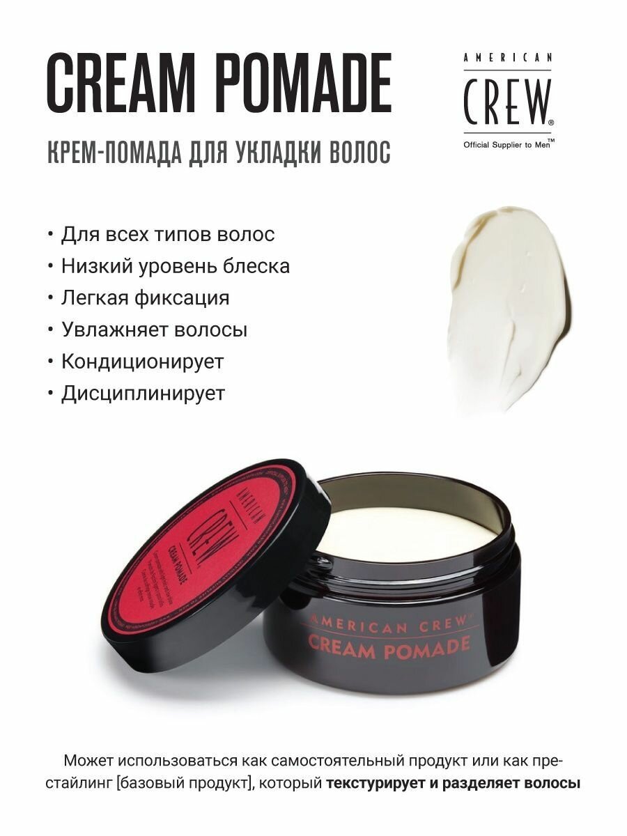 | Полное наименование | American Crew Cream Pomade - Крем-помада с легкой фиксацией и низким уровнем блеска 85 гр |