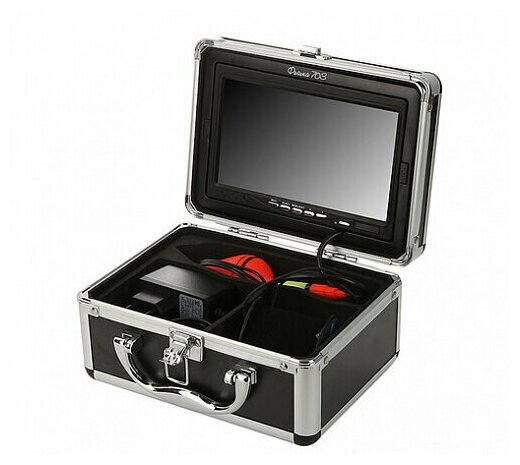7 дюймовый дисплей, прикрытый козырьком обеспечивает отличное качество изображения. Удобный кейс, куда помещаются все элементы прибора, не только позволяет с легкостью транспортировать устройство, но и использовать его по прямому назначению, вынув из кейса только непосредственно камеру, дисплей интегрирован в крышку кейса, а остальные элементы удобно размещаются в отдельных отделениях. Сама камера обладает мощной подсветкой, включение которое контролирует пользователь.