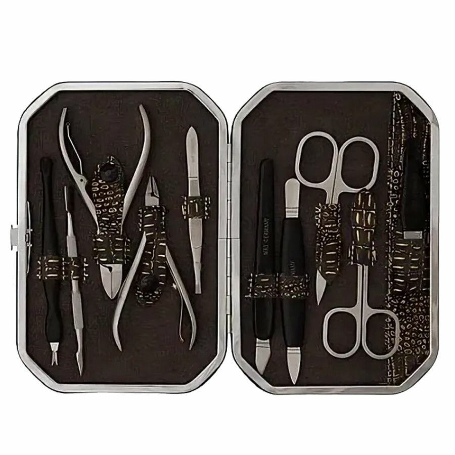 | Инструменты в наборе | пилка для ногтей, ножницы для кутикулы, кусачки для кутикулы, ножницы для ногтей, пинцет, триммер для кутикулы, шабер, пушер (с топориком), кусачки для ногтей |