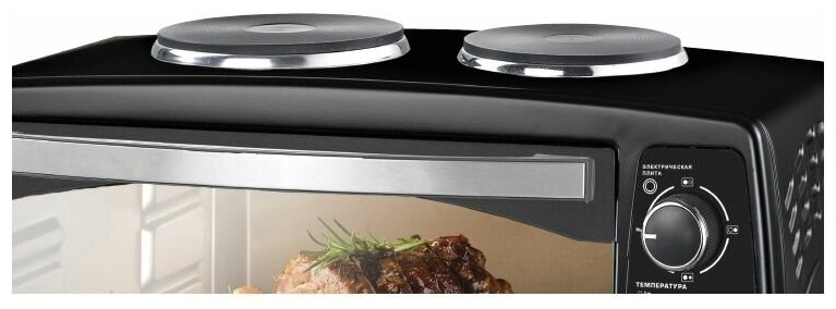 Отличный ростер для использования в общежитии. Хорошо, что одновременно могут работать камфорки и духовка. Тены в духовке можно переключать как по одной, так и оба нагрева сразу. Объём духовки 42л вполне был достаточным для большого протвеня, что не могло не порадовать. Так же есть таймер, что тоже помогает. Внешний вид соответствует картинке и смотрится очень красиво. В работе без проблем. Очень довольна покупкой. Рекоменлдую.