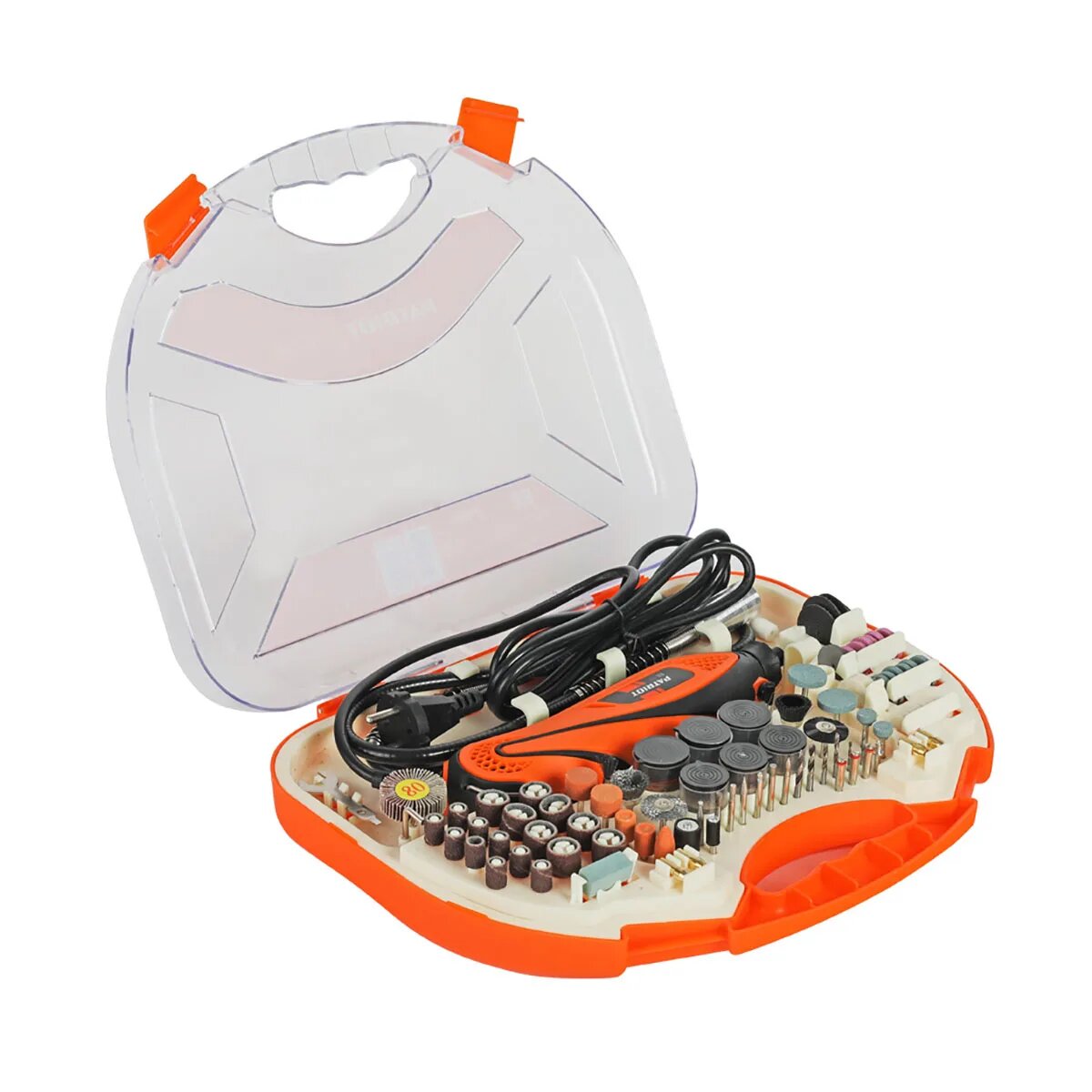 | Комплект поставки | Гравер, Гибкий вал, Шлифовальная лента O15 мм, зернистость 80#, Шлифовальная лента O9 мм, зернистость 80#, Точильный камень 25X10Х10 мм, Точильный камень цилиндрический, O15 мм, зернистость 80#, Точильный камень цилиндрический с углублением, O9.5 мм, зернистость 80#, Точильный камень овальный, O9 мм, зернистость 80#, Насадка торцевая лепестковая, O31 мм, Насадка торцевая лепестковая, O22 мм, Щетка чашеобразная O12 мм, Щетка-кисть O5 мм, Щетка круглая абразивная O22 мм, Щетка круглая абразивная O15 мм, Щетка-кисть абразивная O5 мм, Точильный камень цилиндрический O12.5 мм, зернистость 80#, Точильный камень цилиндрический O6.3 мм, зернистость 80#, Сверло по металлу 3.2 мм HSS, Сверло по металлу 2.4 мм HSS, Сверло по металлу 1.6 мм HSS, Державка для отрезных и полировальных кругов, Держатель O3.2 мм, Полировальный диск O3.2 мм, Цанга 3.2 мм, Цанга 2.4 мм, Цанга 1.6 мм, Войлочный полировальный круг O24 мм, Войлочный полировальный круг O13 мм, Насадка войлочная пуля O10 мм, Полировальный круг O20 мм, зернистость 120#, Полировальный круг O20 мм, зернистость 150#, Полировальный круг O22 мм, зернистость 120#, Отрезной диск O32 мм, Алмазная шарошка коническая малая, Алмазная шарошка коническая большая, Алмазная шарошка узкая, Алмазная шарошка круглая, Алмазная шарошка коническая, Алмазная шарошка овальная, Алмазная шарошка шарообразная, Паста гои красная 3.5Х2.7, Паста гои черная 3.5Х2.8, Красный отрезной диск O24 мм, зернистость 150#, Красная полировальная бумага O20 мм, зернистость 180#, Красная полировальная бумага O20 ММ, зернистость 240#, Фиксатор цанги, Ключ, Инструкция с гарантийным талоном, Кейс |