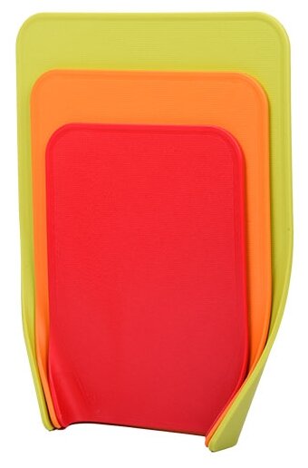 Набор из 3-х ярких разделочных досок разных размеров. Доски плотно прилегают друг к другу для компактного хранения и устанавливаются вертикально для лучшей организации пространства. Закругленные края досок помогут ссыпать продукты точно в посуду. Изготовлены из высококачественного пищевого пластика. Можно мыть в посудомоечной машине.