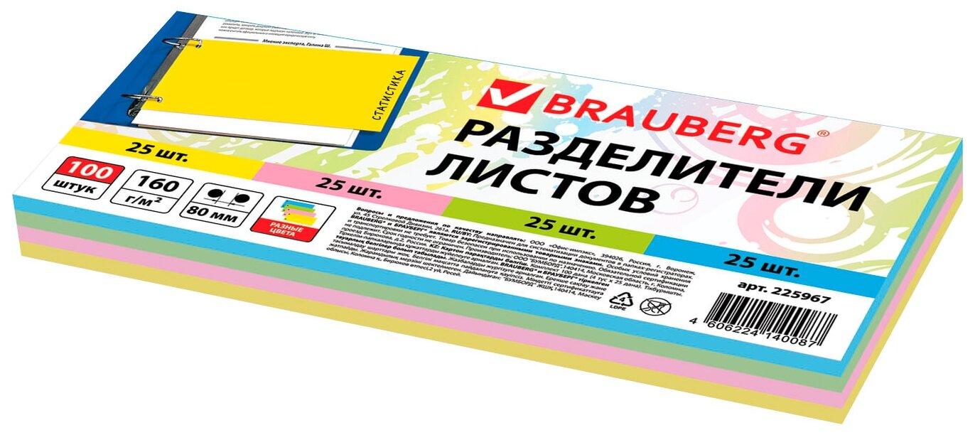 Разделители листов картонные комплект 100 штук (4 цв. х 25 шт.) "Прямоугольные" 240х105 мм BRAUBERG 225967