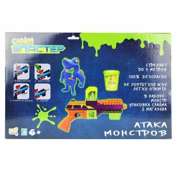 Игровой набор с бластерным оружием фантастического дизайна, мишенью, обоймами для слизи и слизью. Оружие имеет корпус оранжевого цвета и детали зеленого и фиолетового цвета, удобную рукоятку и спусковой крючок. Обоймы со слизью загружаются в верхнюю часть корпуса.