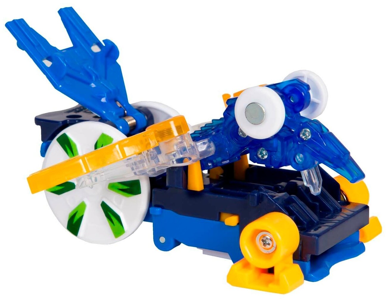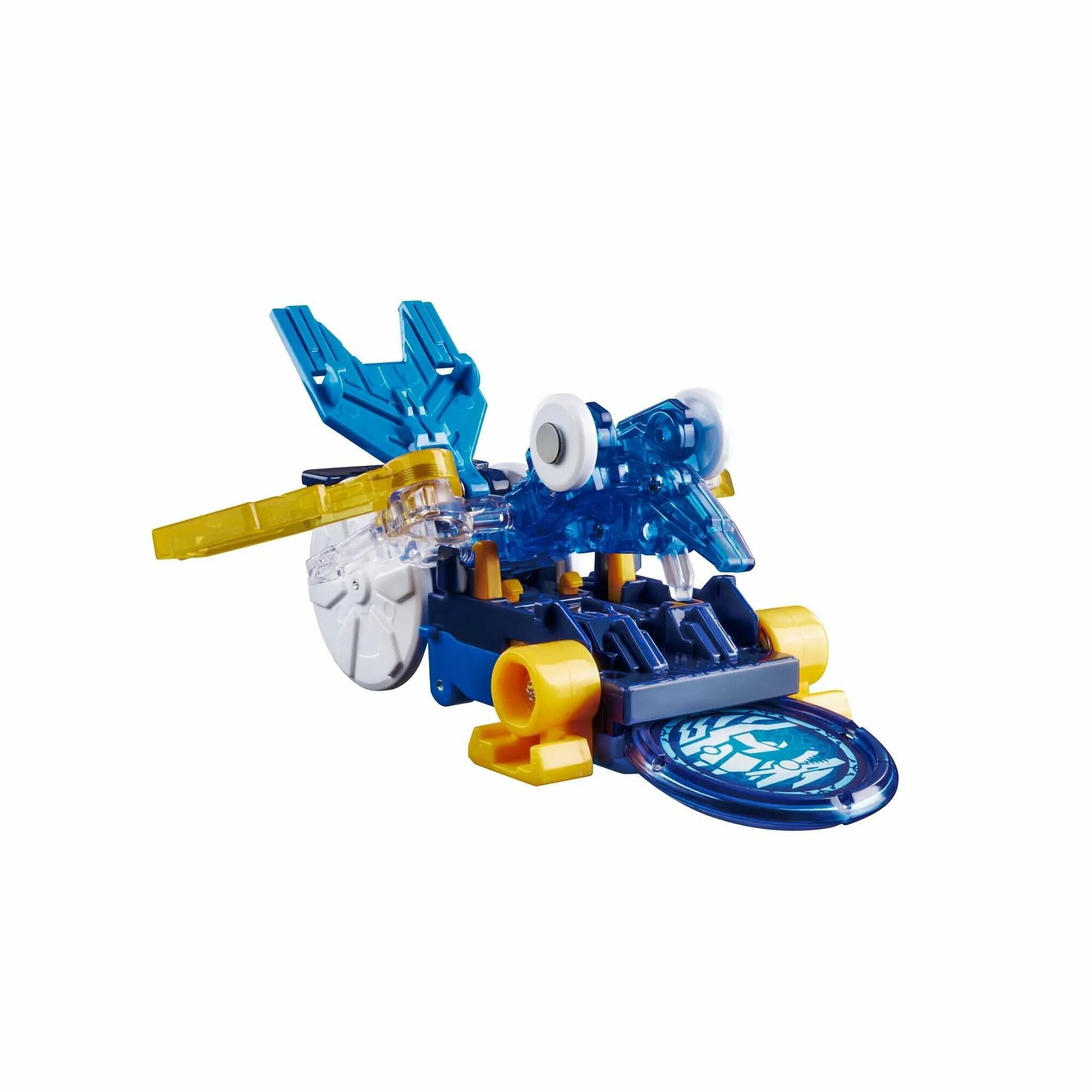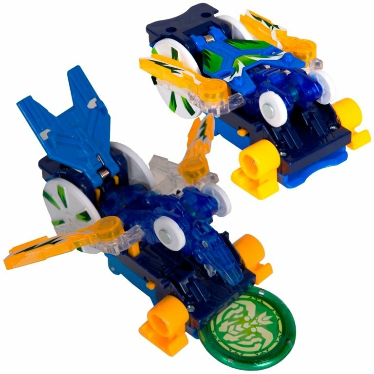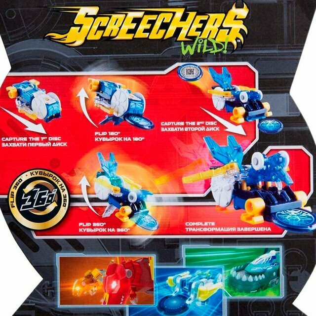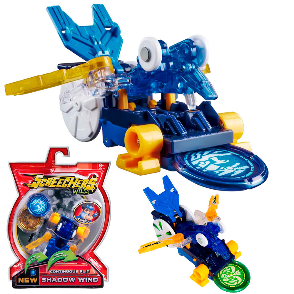 Машинка-трансформер «Скричер Шедоу Винд» 4й линейки, умеющая превращаться в зверя, переворачиваясь в воздухе. Разгоняется, ловит диск, делает кувырок на 180градусов, захватывает второй диск, делает кувырок на 360градусов и самостоятельно трансформируется прямо в воздухе. Обратно в машинку игрушка собирается вручную. Состоит из синих и желтых деталей.