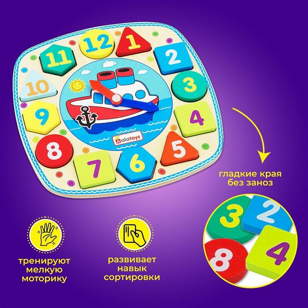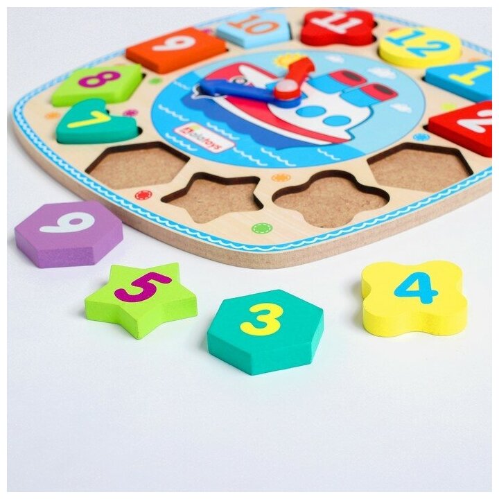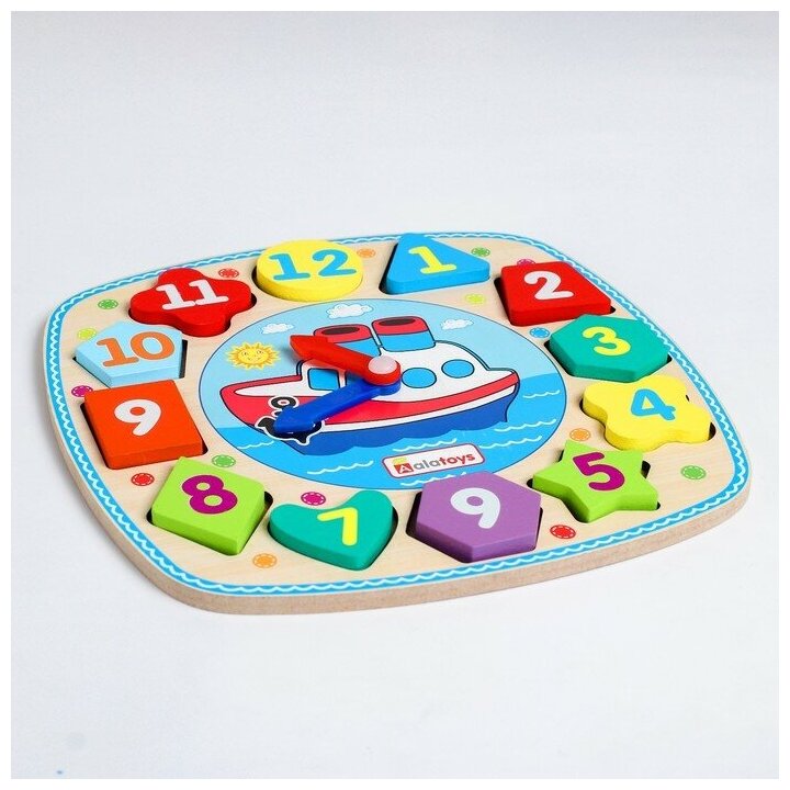 Полезные часы с подвижными стрелками и вынимающимися цифрами. В центре часов изображен красивый кораблик. Ребенок научится последовательному счету, узнает цифры, научится распознавать время и устанавливать правильно стрелки.