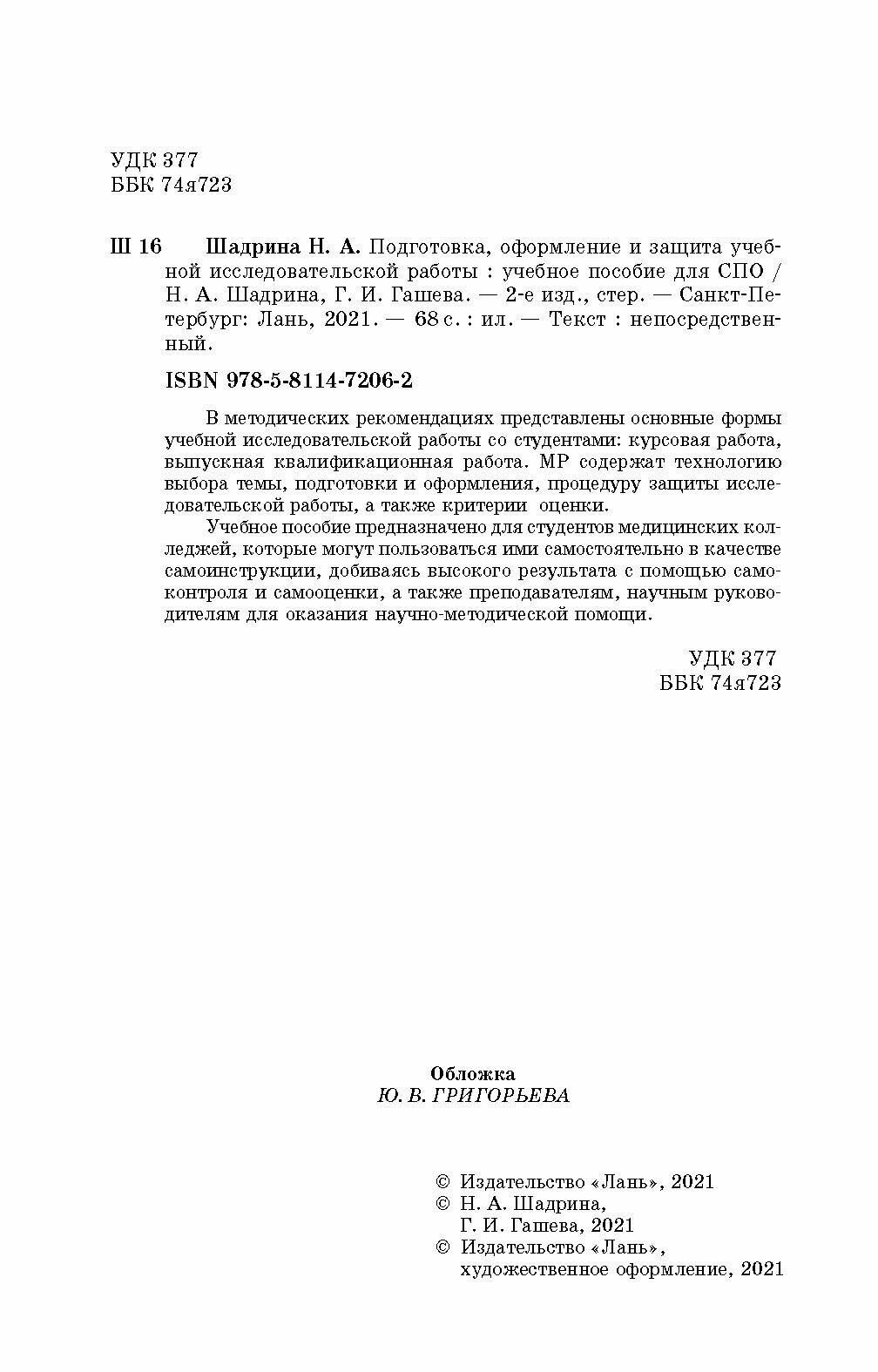 Подготовка оформление и защита учебной исследовательской работы (Шадрина Наталья Александровна, Гашева Галина Ивановна); Лань, 2021