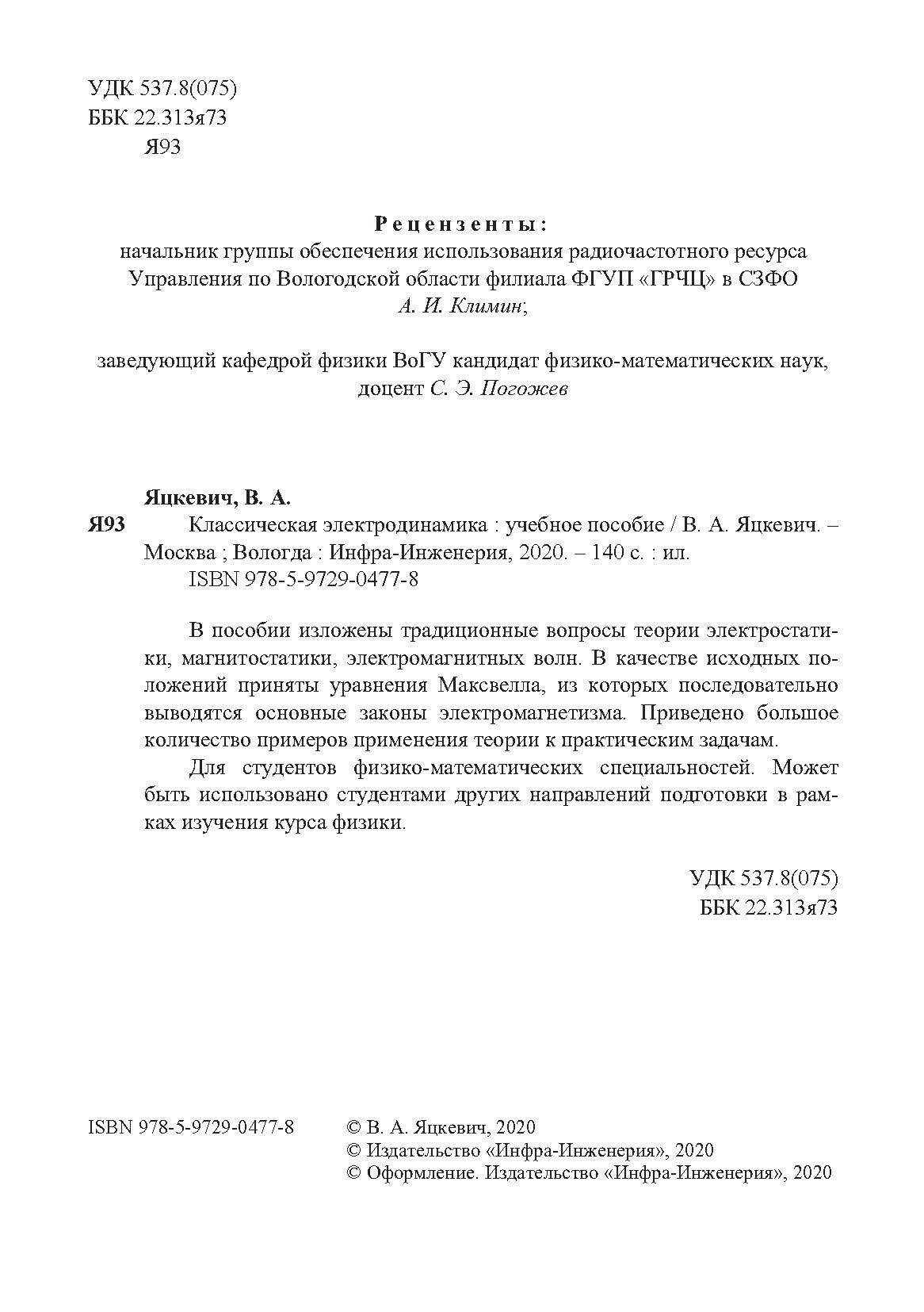 Классическая электродинамика.Учебное пособие (Владимир Антонович Яцкевич); Инфра-Инженерия, 2020