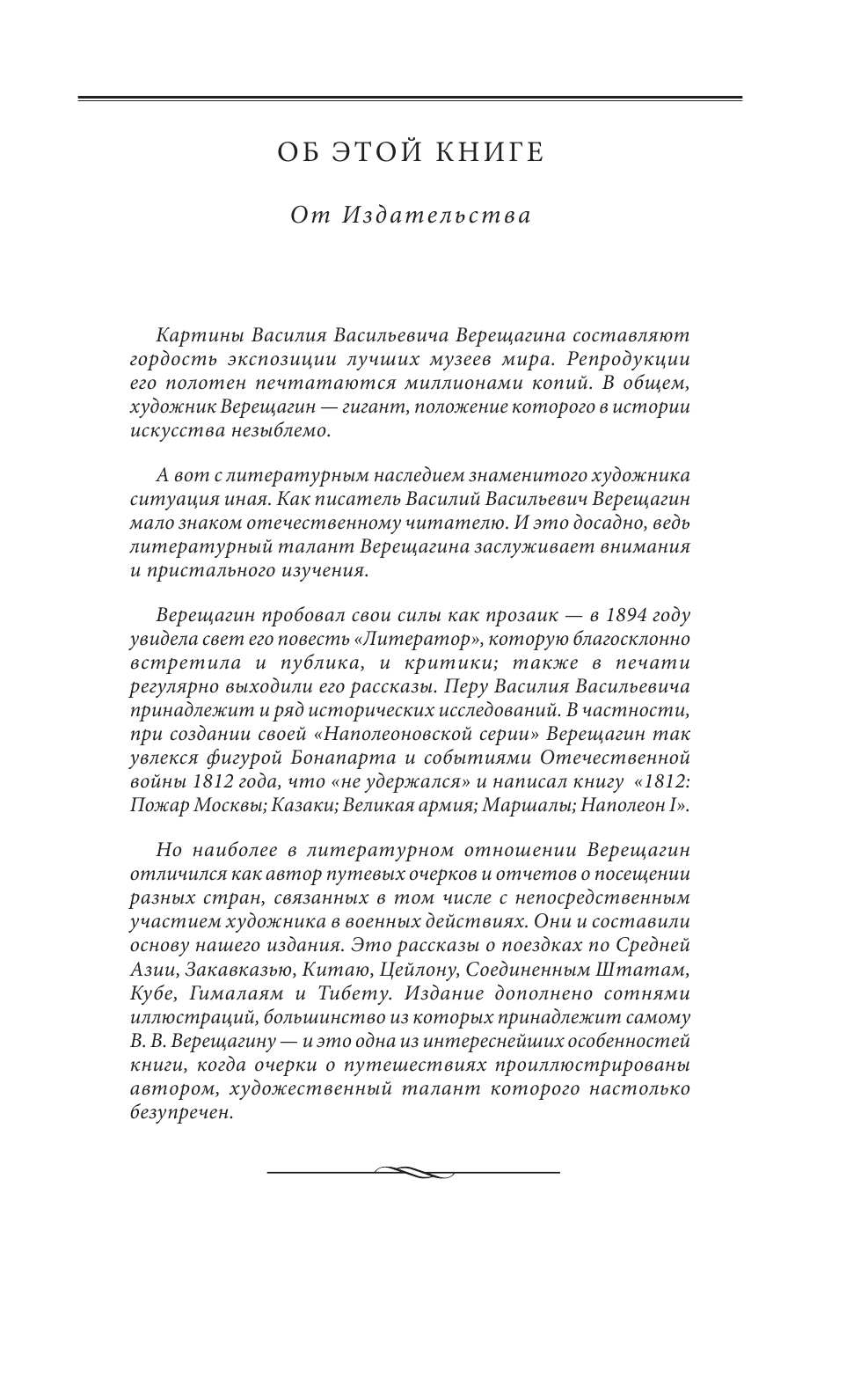 Жизнь знаменитого русского художника-баталиста Василия Васильевича Верещагина (1842 — 1904) напоминает авантюрный роман — со стремительной сменой декораций, стрельбой, бурными сценами, неожиданными поворотами сюжета. Художник объехал весь мир, ссорился с царем, воевал на трех войнах — и проклял войну в своих картинах.Как литератор Верещагин известен своими замечательными очерками и воспоминаниями; перу художника также принадлежит ряд исторических исследований. Но самое ценное в литературном наследии Верещагина — это путевые заметки о посещении разных стран, связанных в том числе и с участием в военных действиях. Они и составили основу настоящего издания. Это рассказы о поездках по Средней Азии, Закавказью, Китаю, Цейлону, Соединенным Штатам, Кубе, Гималаям и Тибету. Издание дополнено множеством иллюстраций, большинство из которых принадлежит самому В. В. Верещагину — и эта одна из интереснейших особенностей книги, когда очерки о путешествиях проиллюстрированы автором, талант которого как художника настолько велик, а нравственная репутация столь безупречна.