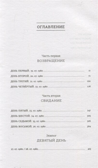1980 год. Загадочная телеграмма заставляет аспиранта Алексея Ноговицына вернуться из стройотряда. Действие романа занимает всего девять дней, и в этот короткий отрезок умещается всё: история любви с умной и жесткой девушкой Мусей, религиозные метания, просмотры запрещенных фильмов и допросы в КГБ. Все, что происходит с героем - не случайно. Кто-то проверяет его на прочность. А фоном - нарядная и душная олимпийская Москва, квартиры, улицы, электрички, аудитории МГУ, прощание с Высоцким, Лужники.