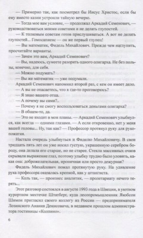 Действие этого остросюжетного романа известного российского писателя Бориса Михайловича Яроцкого разворачивается в лихие 1990-е. Главный герой, талантливый математик, волей случая становится финансовым аналитиком и прогнозистом в компании крупного олигарха. Он оказывается вовлечен в опасную игру предпринимателей вокруг продажи крупного целлюлозно-бумажного комбината на севере России. В центре событий также большая рабочая семья, вся жизнь которой тесно связана с этим комбинатом.