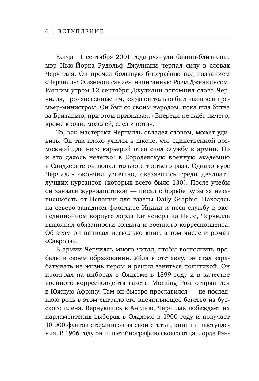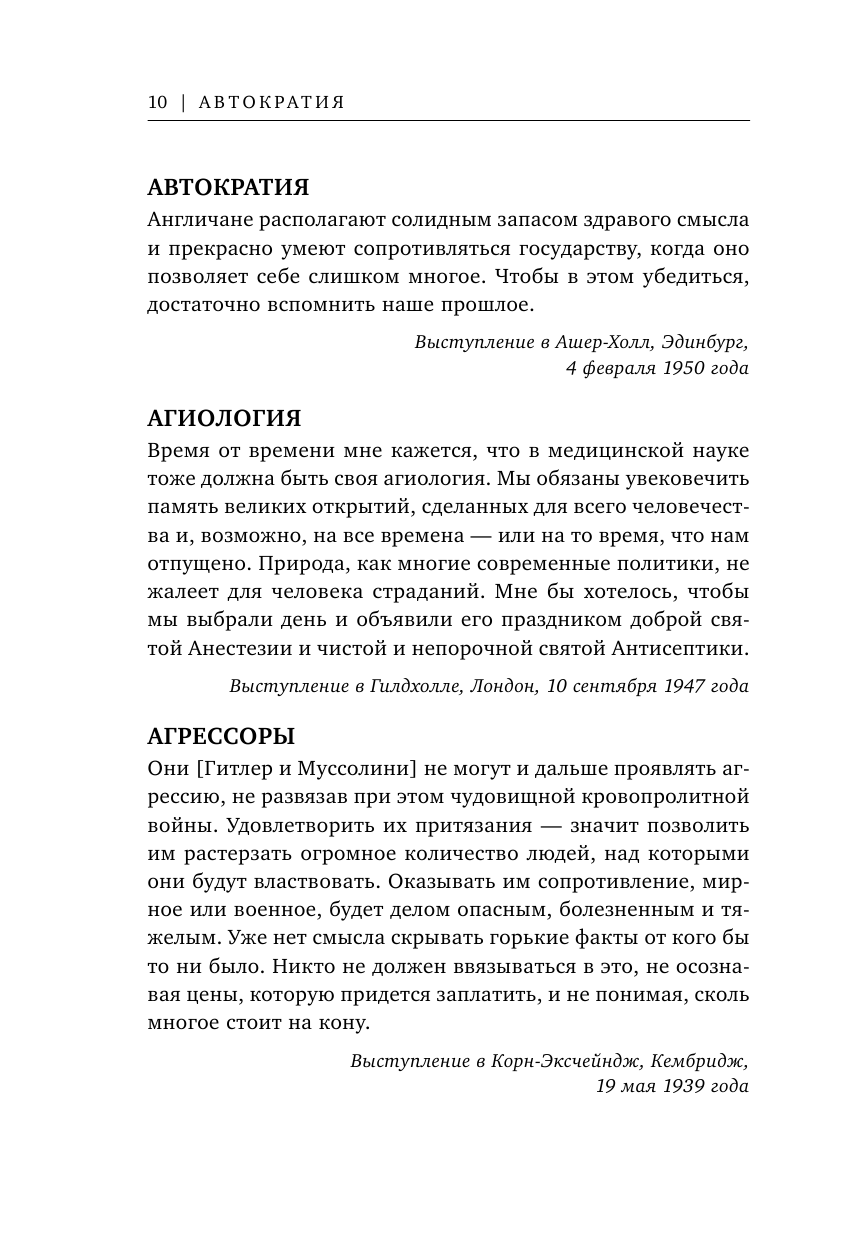 Единственный британский премьер-министр, получивший Нобелевскую премию по литературе, Уинстон Леонард Спенсер-Черчилль родился в 1874 году. Он участвовал в боевых действиях в самых отдаленных уголках британской империи как военный корреспондент и солдат. А потом он стал писателем, историком и политиком. Жизнь дала ему навыки, необходимые для служения Британии в час величайших испытаний. Несмотря на постоянный дефект дикции, Черчилль был выдающимся оратором. Во время Второй мировой войны он использовал всю мощь родного английского языка, чтобы вдохнуть огонь в нацию, которая могла пасть под натиском войск Третьего рейха. В этой книге в алфавитном порядке собраны цитаты этого выдающегося политика.