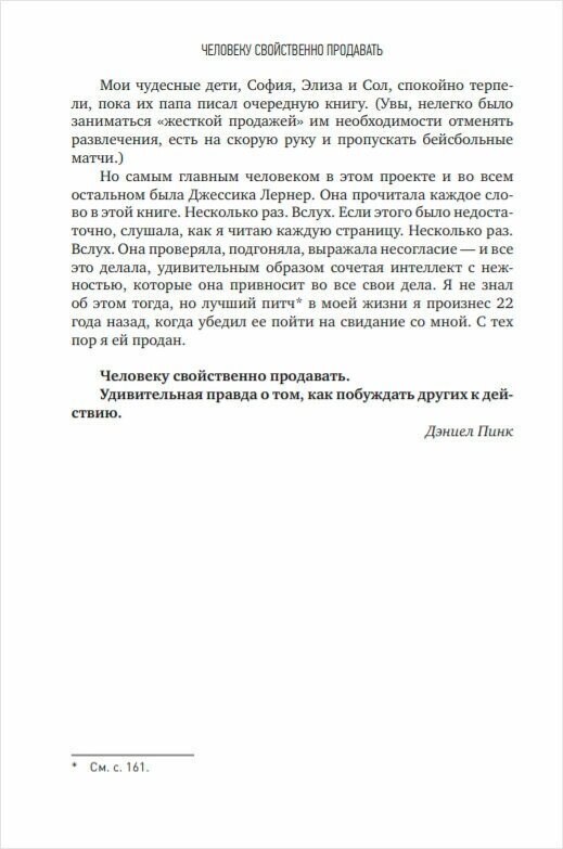 «Это книга о продажах, но она не похожа на другие книги о продажах, которые вы читали (или игнорировали) прежде. Дело в том, что продажи во всех измерениях, будь то продажа автомобилей Buick или предложение идей на совещании, за последние 10 лет изменились больше, чем за предыдущие 100 лет. Основная часть наших представлений о продажах покоится на фундаменте допущений, рассыпавшихся в прах».